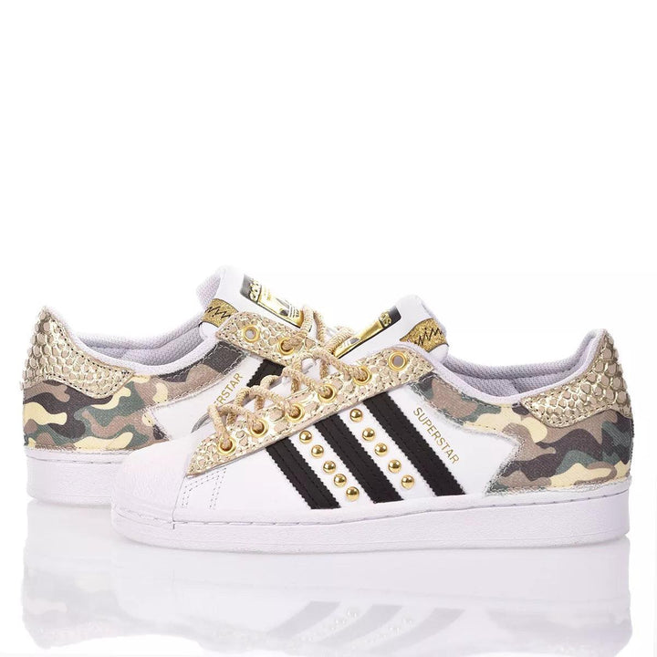 Adidas Superstar Lady Camo ist der maßgeschneiderte Damensneaker, der Rücken des Schuhs ist mit einem Denim-Stoff mit Militärdruck bedeckt, während der Rücken und die Schnürsenkel aus Python-Print-Leder in Creme und Gold bestehen. Das Ganze ist mit runden goldenen Nieten zwischen den Streifen und perfekt abgestimmten cremefarbenen Seilschnürsenkeln mit goldener Laminierung versehen.