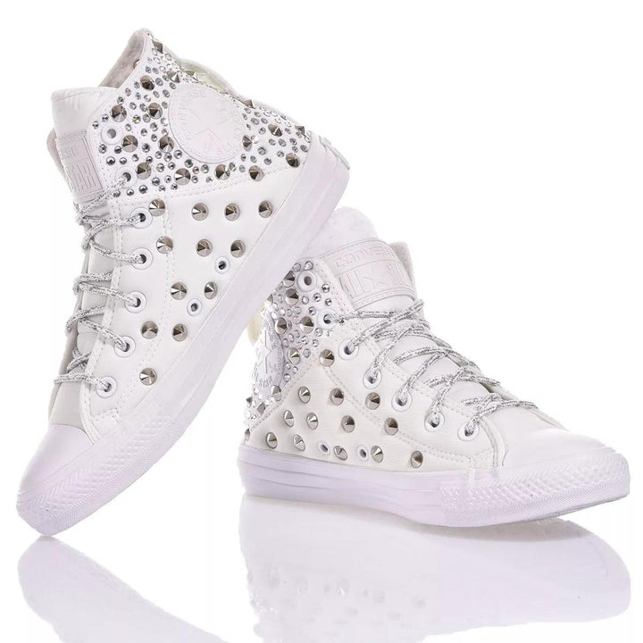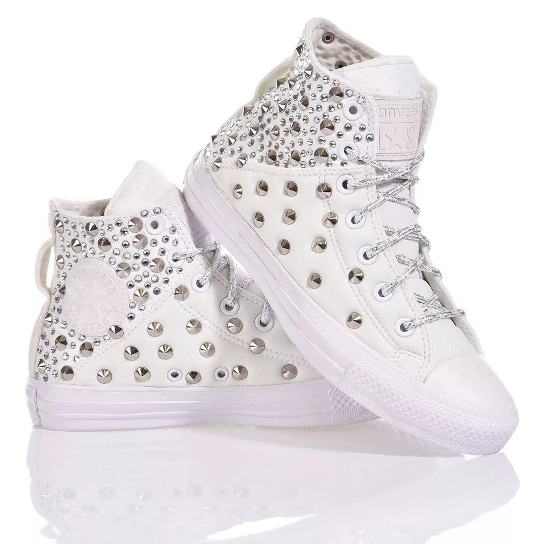 Converse Brea White ist der maßgeschneiderte Damensneaker, der mit weit auseinander liegenden Nieten bedeckt ist, um Platz für die spektakulären Swarovski-Kristalle zu schaffen, die ihn funkeln und kostbar machen.