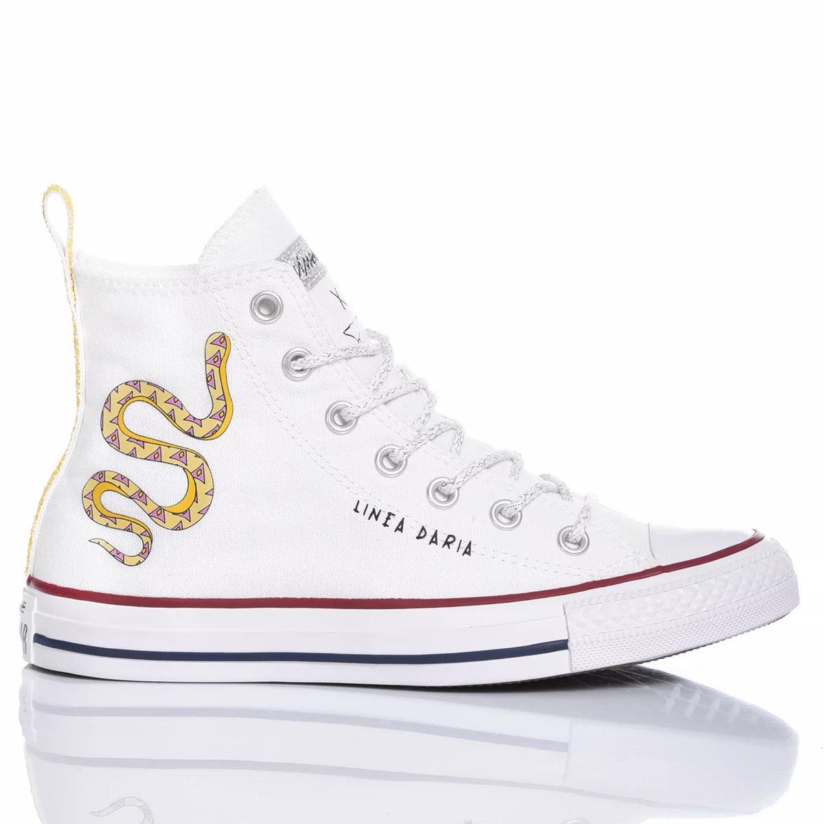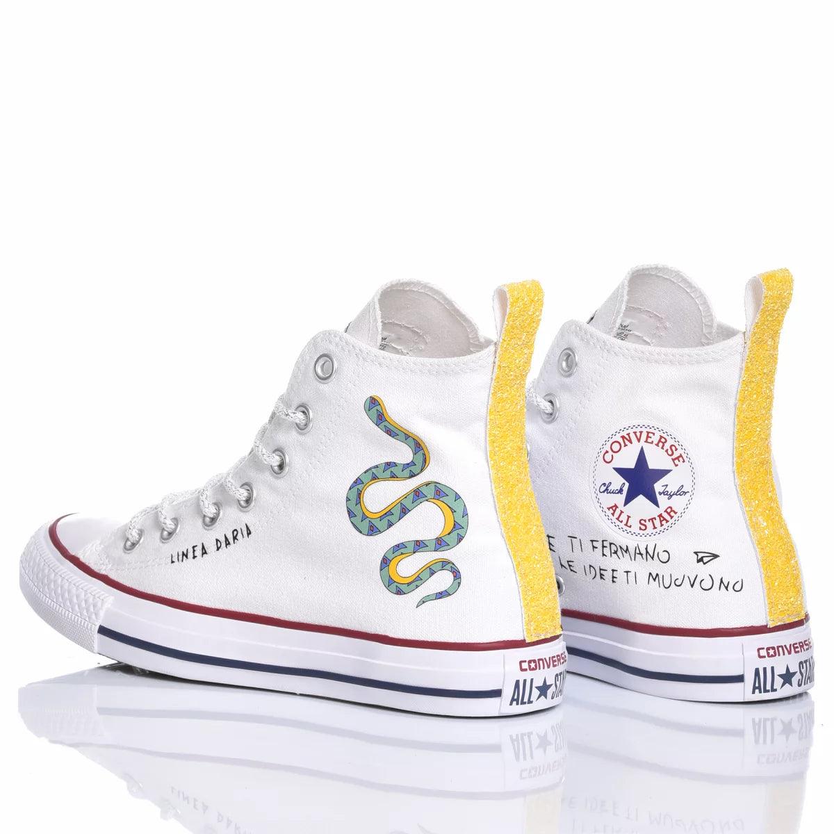 From the special and unique collaboration between “Linea Daria” and MIMANERA comes Converse Linea Daria. Design printed externally and yellow glitter back hand-sewn by us in our workshop.A unique opportunity to purchase the MIMANERA limited edition.Inside the box you will find the original Converse laces and the white laminated laces.