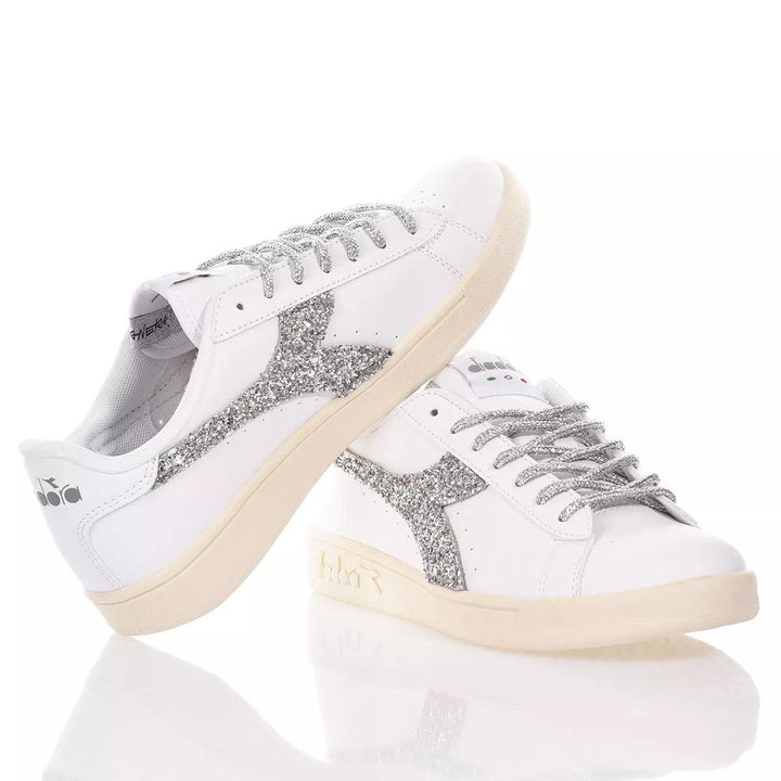 Diadora Glitter Silver, ein klassischer total weißer Sneaker, aufgefrischt mit einem Hauch von silbernem Glitzer, der das Logo bedeckt. Dieser Damensneaker ist einfach, aber brillant stilvoll und verleiht Ihrem Look Komfort und Stil.