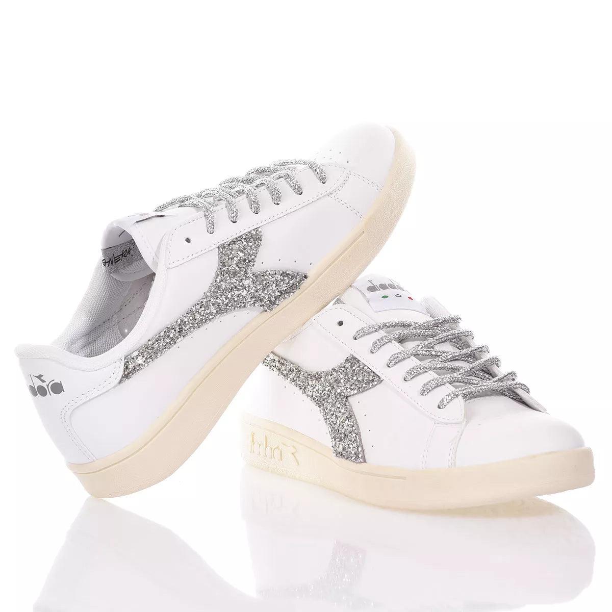 Diadora Glitter Silver wird mit silbernen laminierten Schnürsenkeln geliefert, zusätzlich zu den originalen weißen.