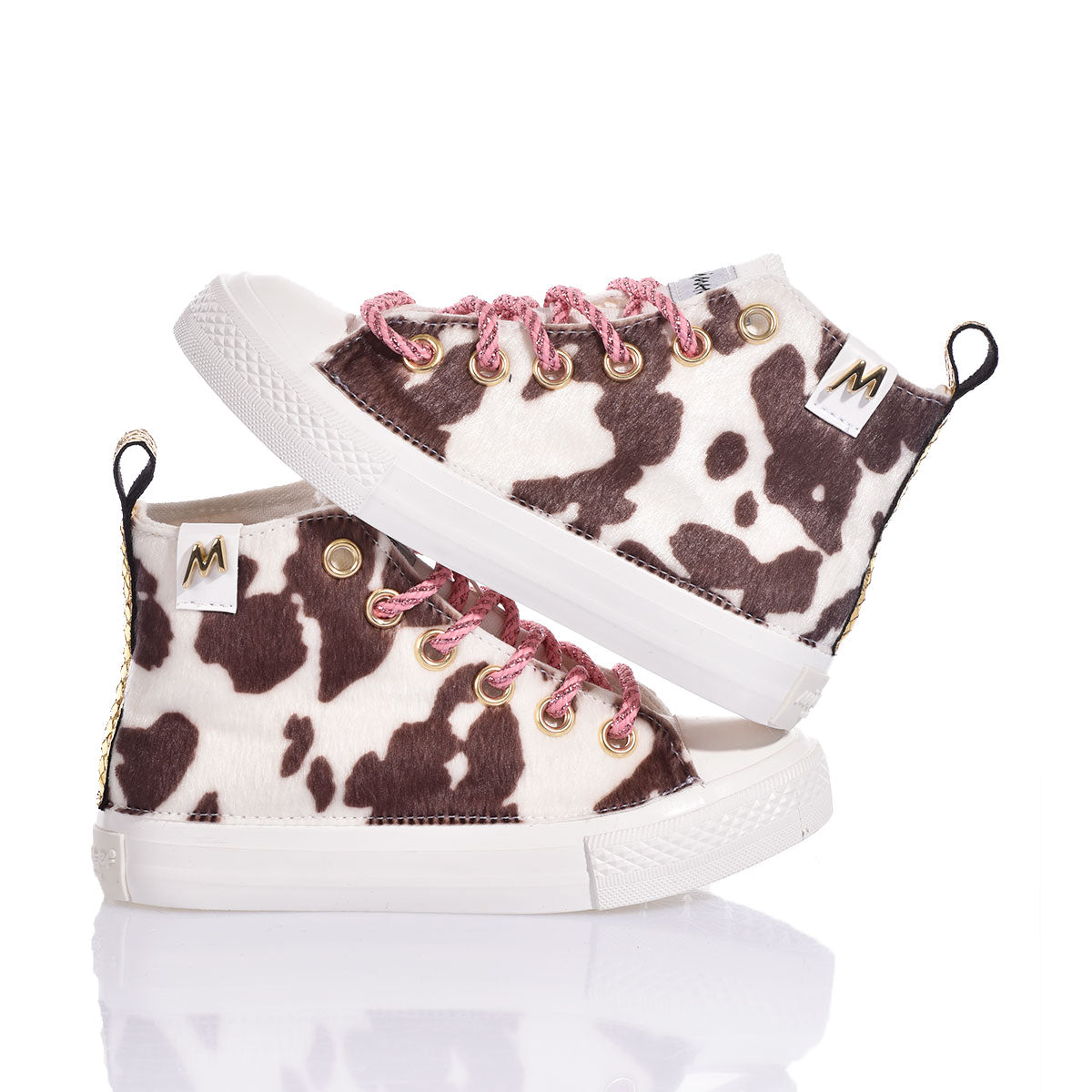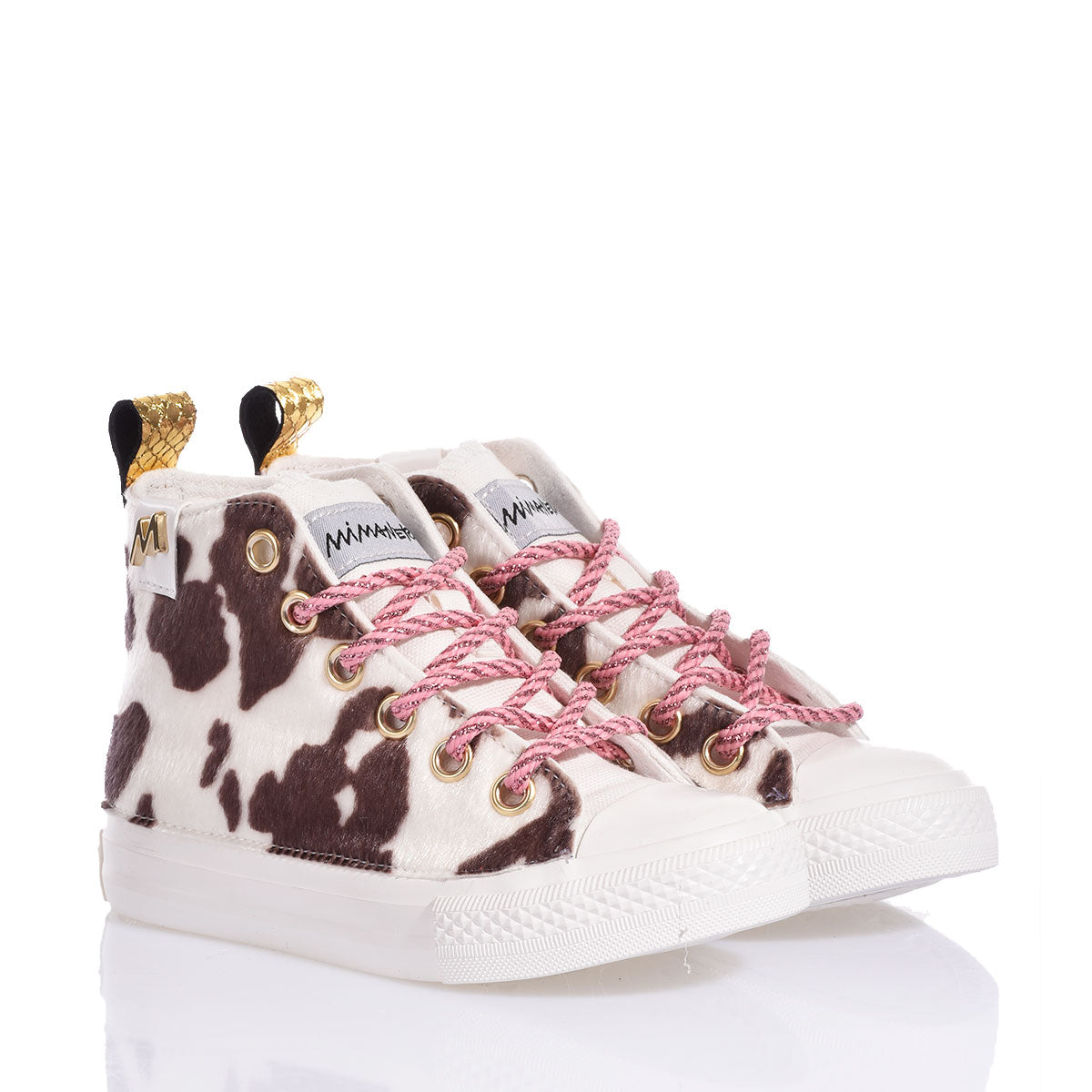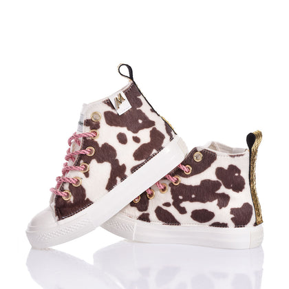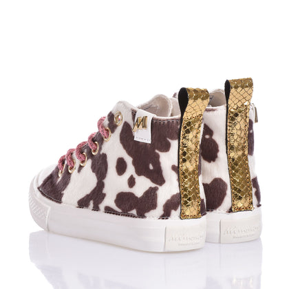 Mimanera Airlines Junior Cow ist der ideale Sneaker für junge kreative Köpfe, die ihren Stil mit Selbstbewusstsein zeigen wollen. Inspiriert vom klassischen Converse-Modell überzeugt er mit einem Obermaterial aus Ponyfell-Effektstoff mit Kuhmuster – wild im Charakter, aber immer cool. Die Fersenkappe aus goldfarbener Python-Kunstleder verleiht einen trendigen, glänzenden Akzent, während die rosa Torchon-Schnürsenkel mit Lurex-Fäden für einen originellen und funkelnden Touch sorgen.
