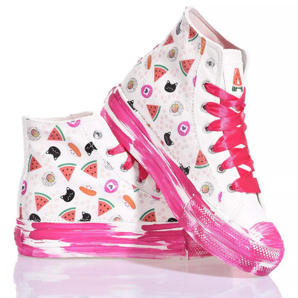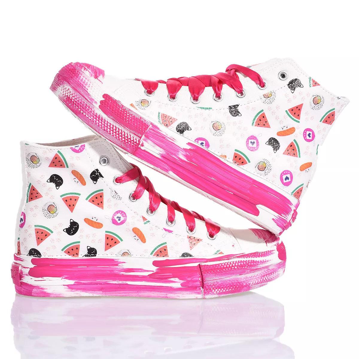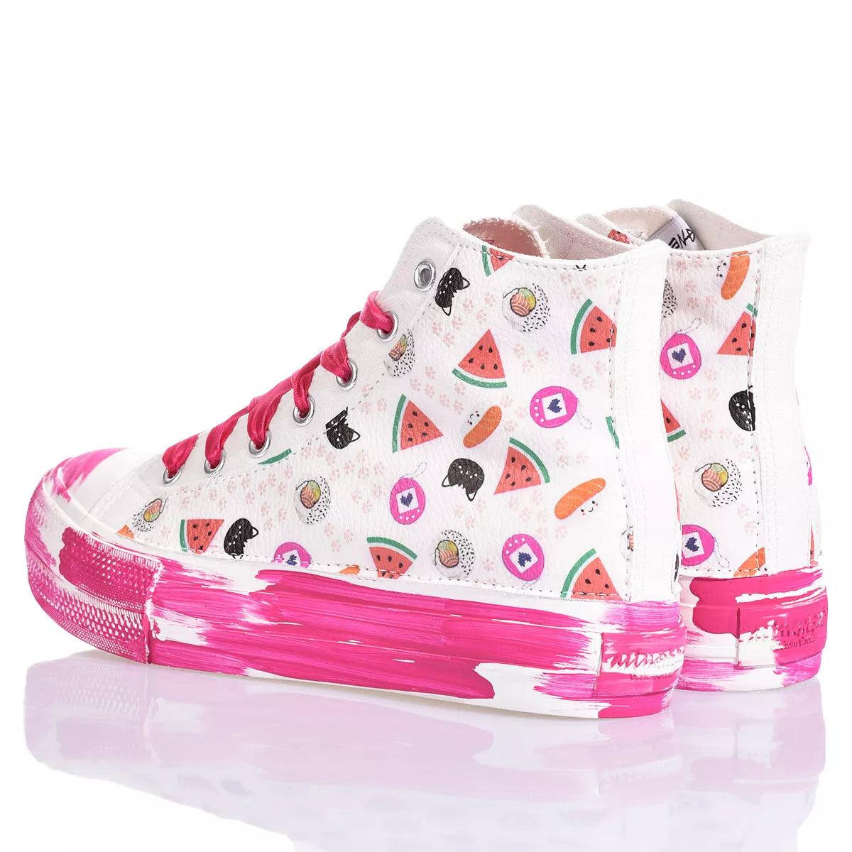 Bringen Sie Freude in jeden Schritt mit den Mimanera Sneakers, inspiriert vom ikonischen Converse-Modell in Zusammenarbeit mit Alyssa von Silvia & Kids. Das einzigartige und verspielte Design verfügt über ein süßes und zartes Muster an den Seiten und eine fuchsiafarbene Plateausohle mit Pinselstrich-Effekt, für einen lebendigen und femininen Touch. Fuchsiafarbene Satin-Schnürsenkel verleihen dem Look eine Note von Eleganz und Raffinesse. Aber das eigentliche Highlight dieser Sneakers ist die Anpassungsoption. Sie können den Anfangsbuchstaben Ihres Namens mit der lustigen Wassermelonen-Schrift hinzufügen, wodurch jedes Paar einzigartig und besonders wird.