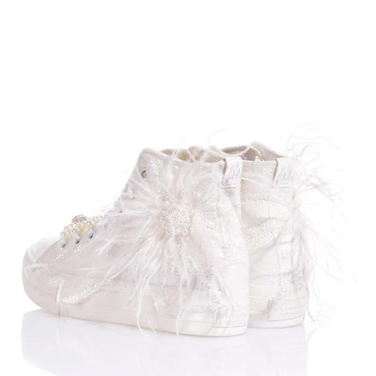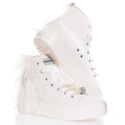 Weiße Ösen und zarte weiße Satinschnürsenkel mit Perlen und einer Swarovski-Kugel vervollständigen die luxuriöse Ästhetik, was die Mimanera Airlines Platform Gabrielle zum idealen Accessoire für alle macht, die einen einzigartigen und raffinierten Look wünschen. Tragen Sie diese Sneaker, um ein Statement zu setzen und alle Blicke auf sich zu ziehen.