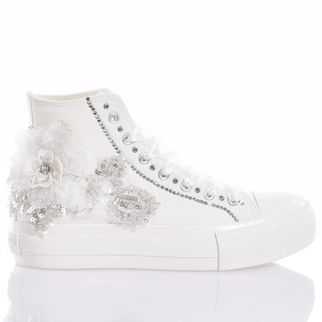 Mimanera Airlines Platform Red Amabel: ein Traum wird wahr. Inspiriert vom klassischen Converse-Modell verfügen diese Sneakers über eine komplett weiße Plateausohle, die ein unverkennbares Gefühl von Auftrieb und Komfort bei jedem Schritt bietet. Die Mimanera Airlines Platform Red Amabel ist mit exquisiter bordeauxfarbener, bestickter Spitze bedeckt, mit einer weißen Satinschleife am Rücken, und wird durch eine Reihe von Swarovski-Kristallen an der Ferse und elegante weiße Satinschnürsenkel veredelt.