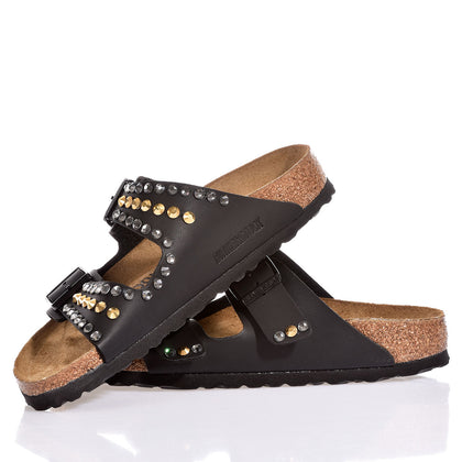 Birkenstock Arizona Black Diamond: The classic black base meets modern luxury with rows of oversized Swarovski crystals in gold and anthracite. A bold yet refined contrast that lights up the iconic silhouette, without compromising the unmistakable Birkenstock comfort. Perfect for those who walk with style and personality.