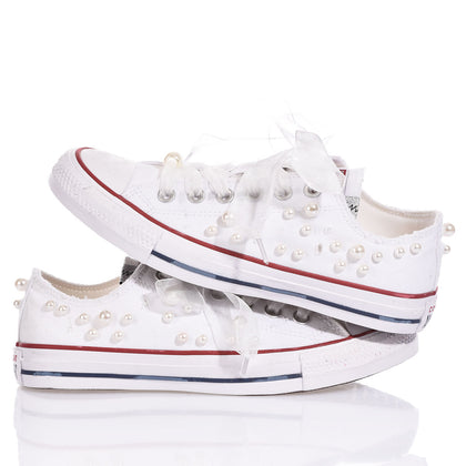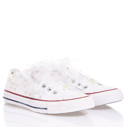 Converse Pearls White Ox is the perfect sneaker to elevate any look with a blend of edge and romance. Pearls and distressed details create a bold contrast, while organza laces tie into a delicate, feminine bow.