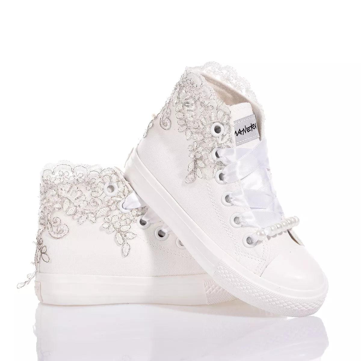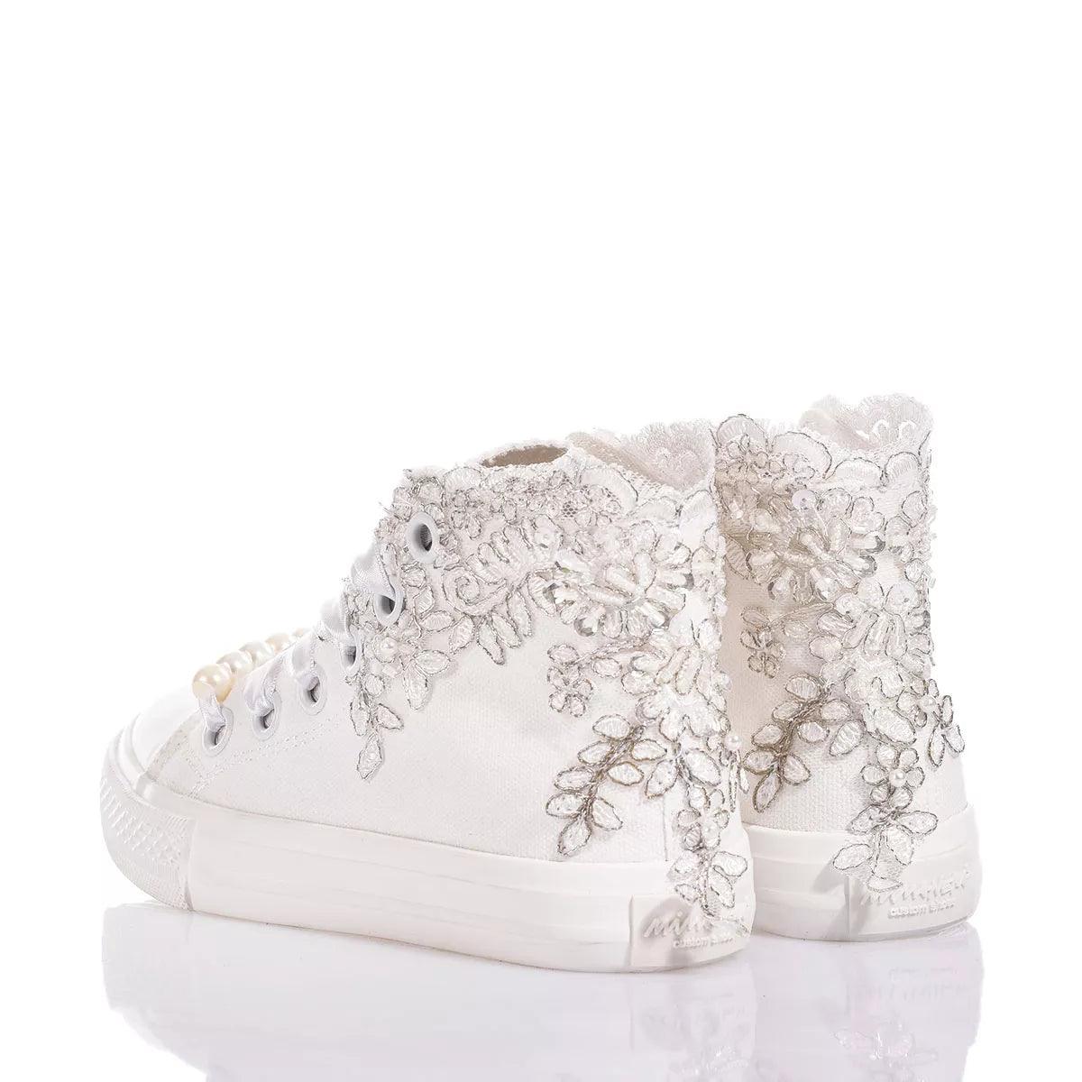 Mimanera Airlines Junior Lucy is the delicate and elegant sneaker for the little ones! Inspired by the iconic Converse model with a completely white sole and exclusive design: white and silver scalloped embroidery with sequins, pearls, and beads along the entire ankle, softly covering the sides of the sneaker. The look is completed with white satin laces and removable pearls at the base of the lacing.