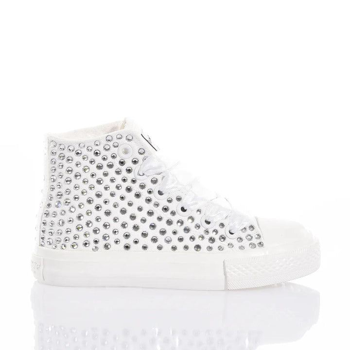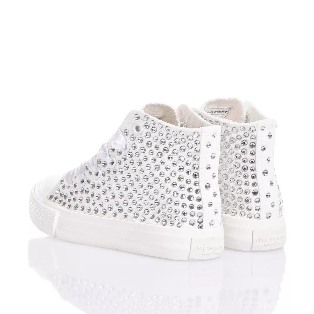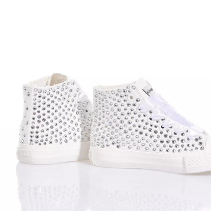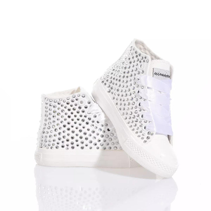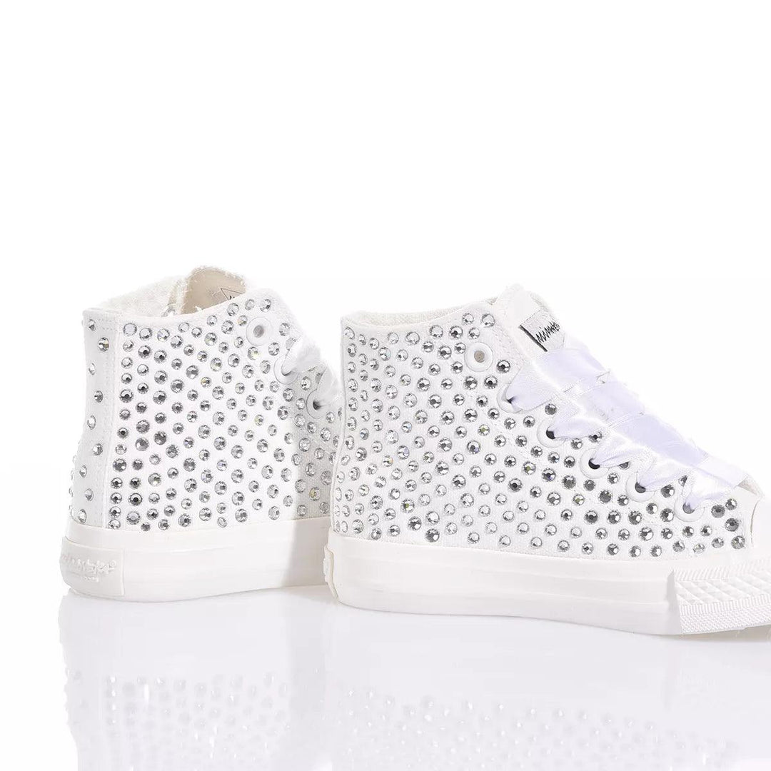 Mimanera Airlines Junior Swarovski is a little gem inspired by the classic Converse model but offering a completely white sole to make it even more delicate and elegant. A shower of Swarovski crystals covers the sneakers, giving an incredible light to every step.