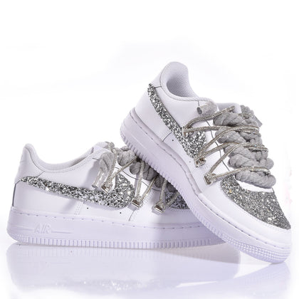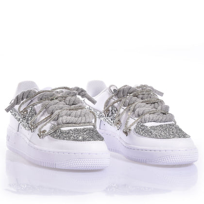 Nike Air Force 1 Custom with double grey rope laces and Swarovski crystals. Swoosh and toe enhanced with silver glitter for a luxury effect. A personalized sneaker that combines the iconic AF1 style with couture elements. A unique piece for those seeking exclusivity and refinement.