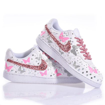 Custom Nike sneakers with pink and silver butterflies that catch the light. Swarovski crystals applied on the Nike swoosh for a sparkling luxury detail. Each pair is a unique work of art, perfect for those who want to transform a classic into a style statement.