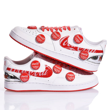 Nike sneakers transformed into a tribute to the Coca-Cola legend. These shoes feature exclusive details: precisely applied Coca-Cola caps and a customized Swoosh showcasing the brand’s iconic red and white logo. A limited edition that blends sporty design with pop culture, perfect for those who want to make a bold statement.