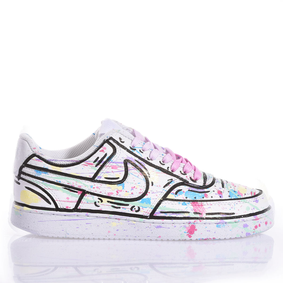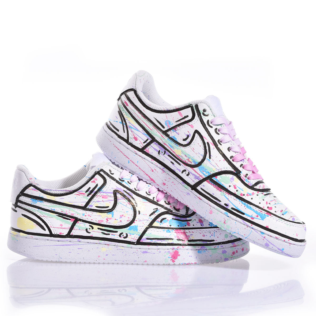 Nike Comics Aurora: hand-painted sneakers featuring vibrant cartoon illustrations and paint splashes. Each pair is a unique piece, transforming the shoe into a wearable canvas with artistic details and bold colors. Crafted with artisanal care, perfect for those seeking a creative and individual expression in their style.
