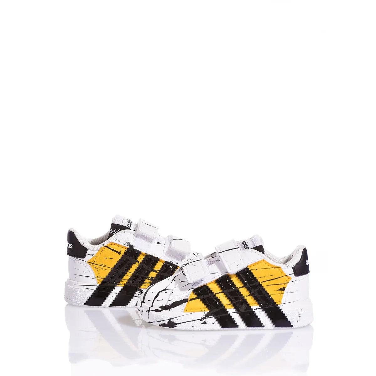 Adidas Bee Sketches is the custom men's sneaker with a street and bold vibe. Covered in yellow fabric with black PVC stripes that resemble street-style sketches all over the shoe.