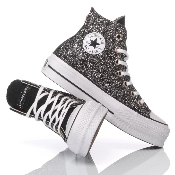 Converse All Star Platform Glitter Black, the women's trainer has had a makeover. Covered in black glitter on both the outer and inner sides, because glitter is never enough, your feet deserve to sparkle to the max. The Converse All Star Platform Glitter Black comes with its original white laces. For extra comfort, we offer you our heel lift insole, which, in addition to comfort, gives you a few extra inches and an immediate figure-enhancing boost.
