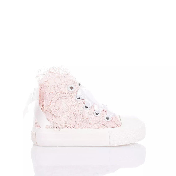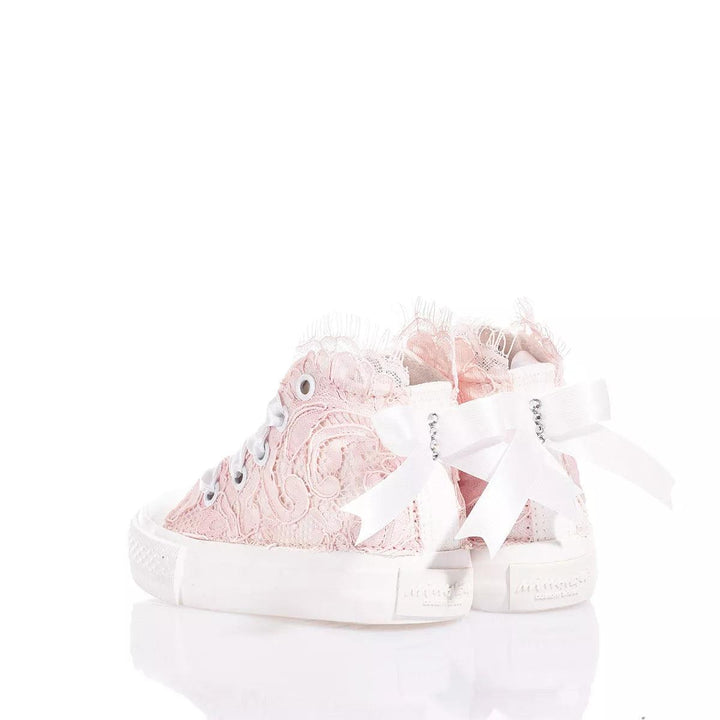 Inspired by the classic Converse model, covered in fine embroidered lace in a delicate shade of pink and featuring a satin bow on the back, all embellished with a row of Swarovski crystals on the heel and elegant white satin laces, making this model super glamorous even for the little ones!