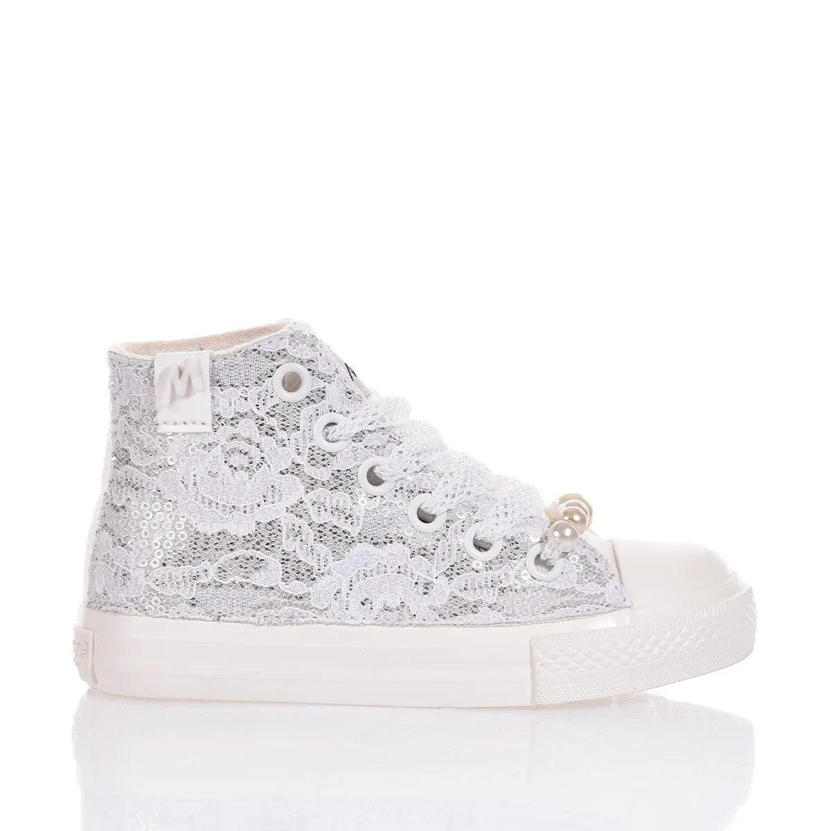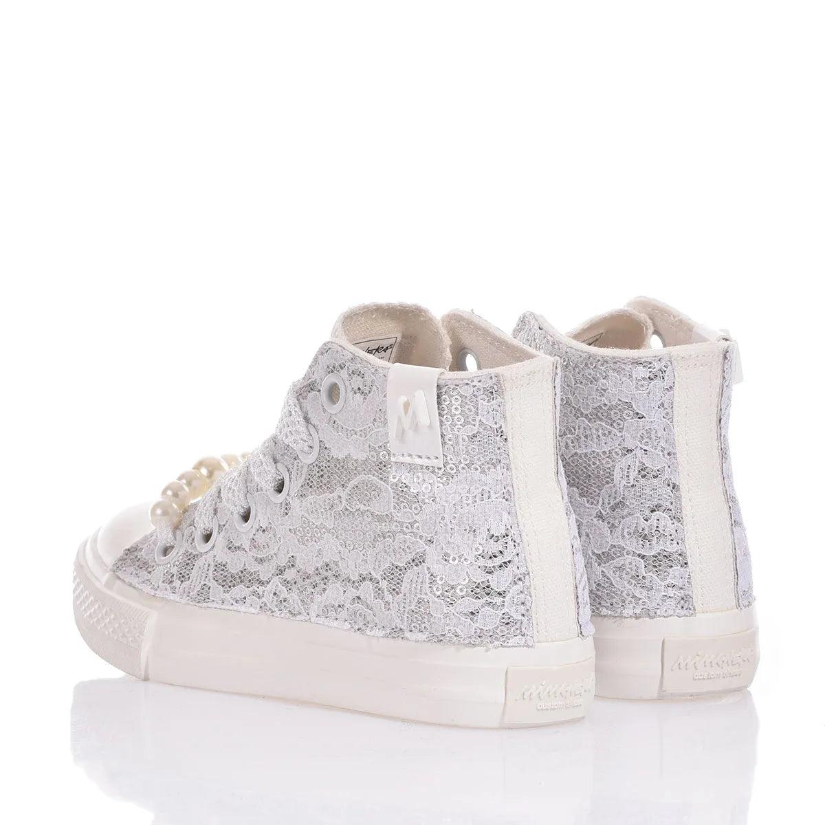 Inspired by the classic Converse model, these sneakers feature a completely white sole and an exclusive design with silver sequined fabric and a delicate layer of white lace overlay, creating a refined contrast. The look of this sparkling sneaker is completed with white perforated laces and removable pearls at the base of the lacing.