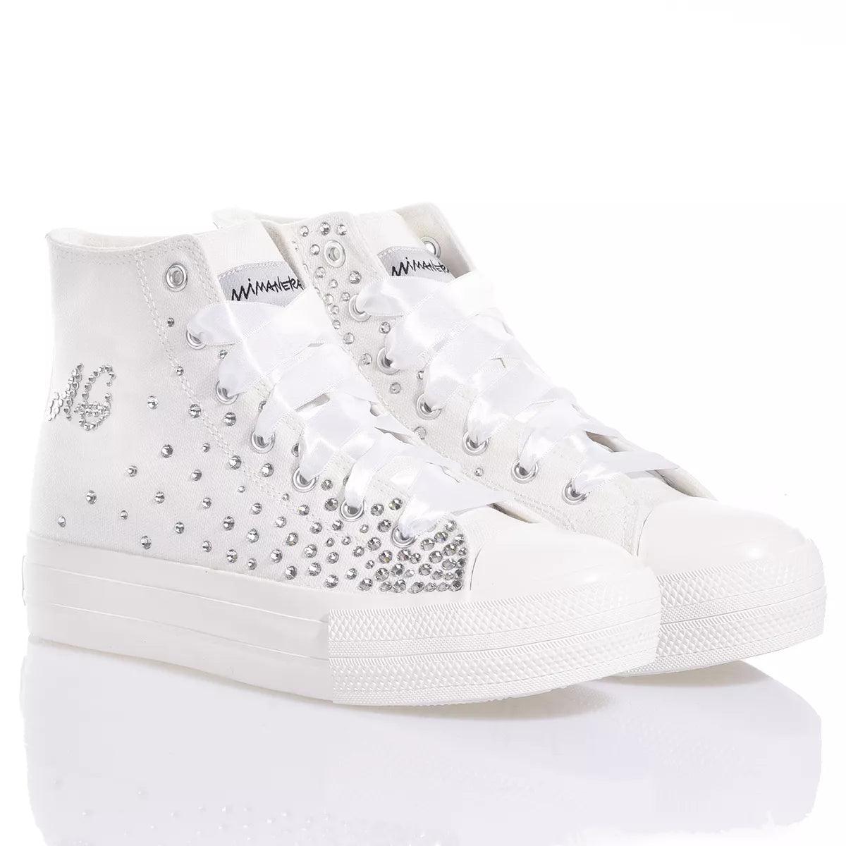 Mimanera Airlines Platform Lovefool: the perfect synthesis of elegance and timeless style, ideal for special occasions. Inspired by the classic Converse model, Mimanera Airlines sneakers feature a completely white platform sole that adds momentum to the silhouette while maintaining impeccable comfort.