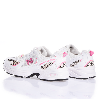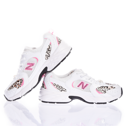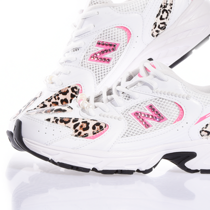 New Balance 530 Pink Safari: stampa leopardata e cristalli Swarovski rosa che brillano ad ogni passo. Una sneaker audace e femminile che non passa inosservata.
