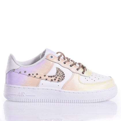 Nike Air Force 1 Pastel Sunset — Exclusive edition, hand-customized with pastel tones inspired by sunsets. Each pair is embellished with Swarovski crystals carefully applied by hand on the Nike swoosh, creating a luminous and unique finish. Perfect for those seeking sophisticated style and comfort, it combines the timeless elegance of the Air Force 1 with handcrafted luxury details.