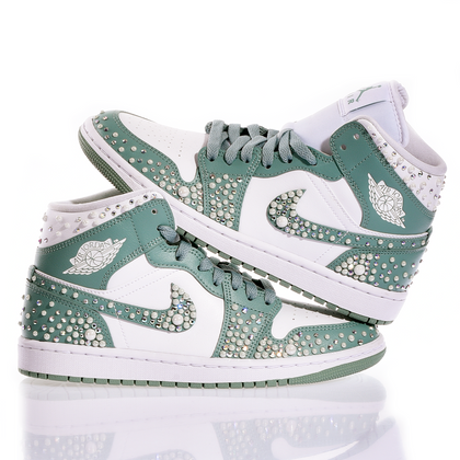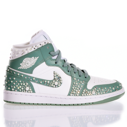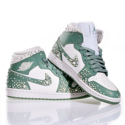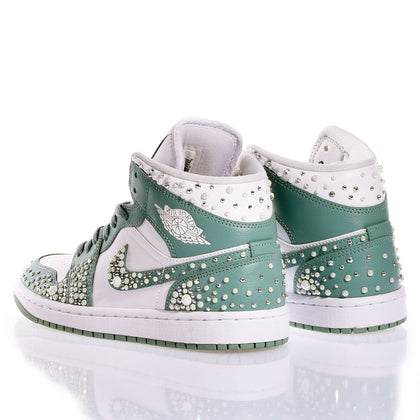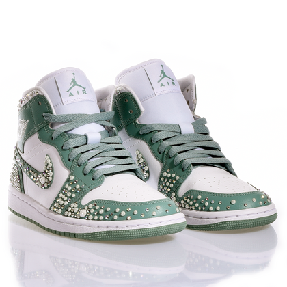 Nike Air Jordan 1 Bling-Bling Alchemy. A classic Air Jordan 1 in emerald green, embellished with shimmering pearls and Swarovski crystals. A sneaker that blends the luxury of legendary basketball heritage with bold, playful elegance. Perfect for those who want to shine in style.