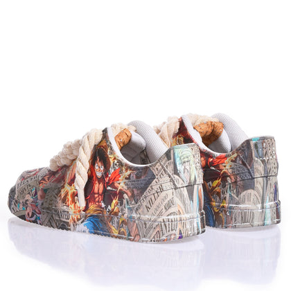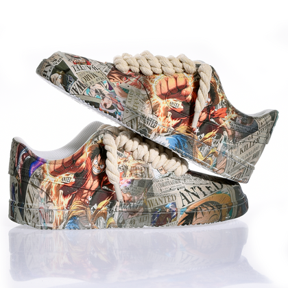 Custom Nike Jolly Roger featuring a hydro-dipped finish that creates an extraordinary visual effect. Each pair is unique, completed with premium rope laces and a custom One Piece box. Perfect for those who want sneakers that tell a story and grab attention. Handcrafted customization that transforms a classic into a wearable work of art.