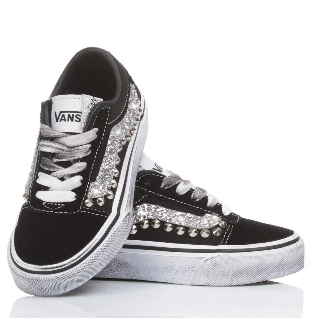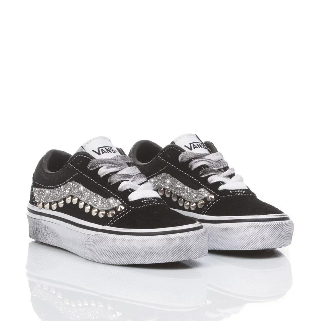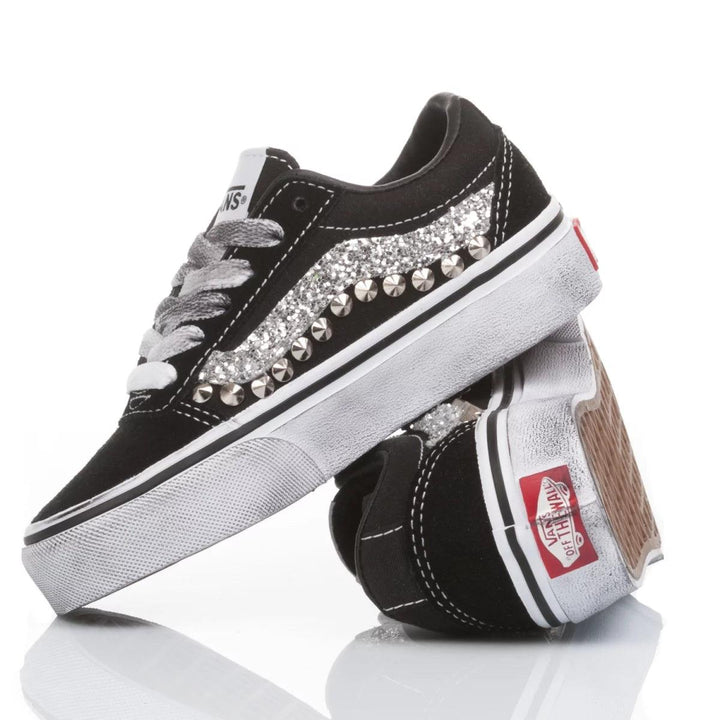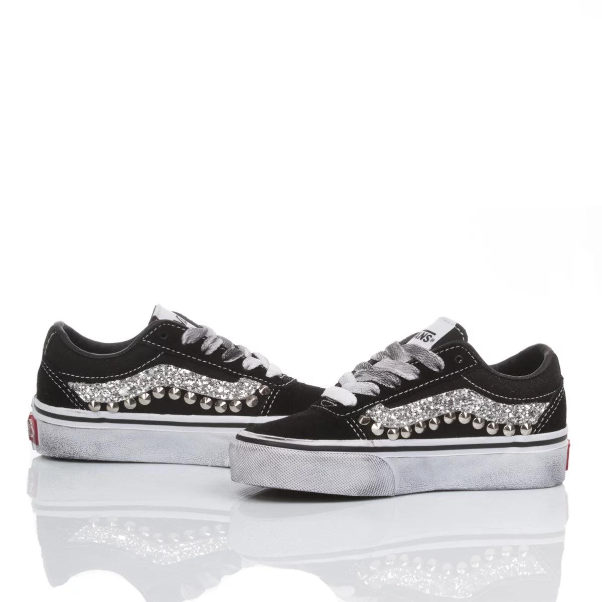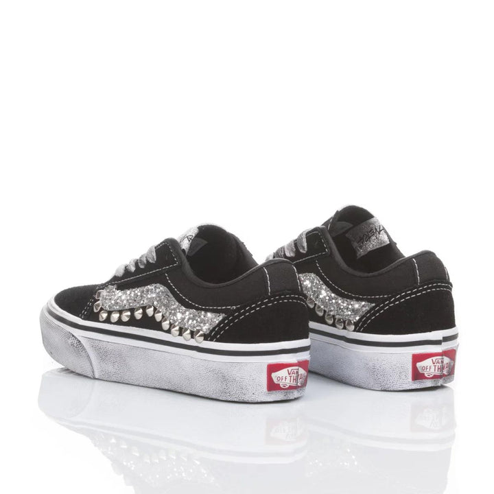 Sides with silver glitter and silver studs, vintage dirt, white original shoelaces.