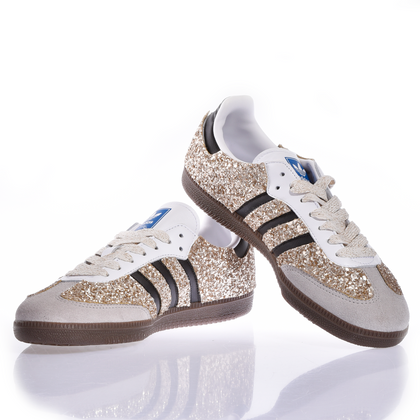Adidas Samba Shimmer Gold – el icono de las sneakers que brillan como nunca. Cubierta de purpurina dorada brillante, esta creación de Mimanera aporta un toque de lujo luminoso a cada movimiento. Con cordones blancos y detalles dorados, más los cordones originales de Adidas incluidos para variar tu estilo.