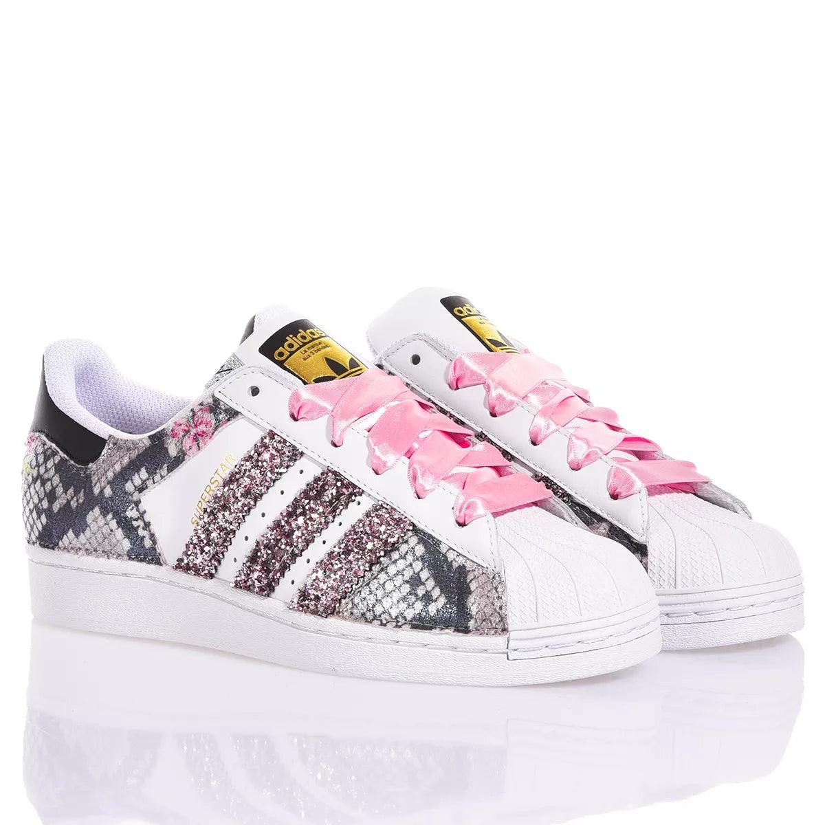 Adidas Superstar Blossom è la sneakers custom da donna frizzante e super femminile: Fantasia mix animalier e floreale sui lati, sdrammatizzatida dalle tre iconiche righe adidas glitterate. Completano il look i lacci in raso rosa.