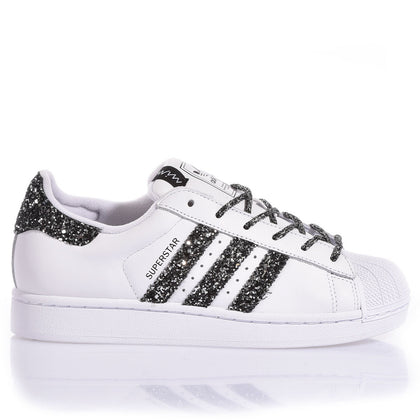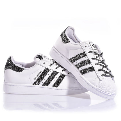 La parte trasera y las icónicas franjas laterales brillan con purpurina negra, mientras que los cordones laminados negros completan el look sofisticado. Cada detalle ha sido cuidado para resaltar la elegancia lujosa de esta edición especial.