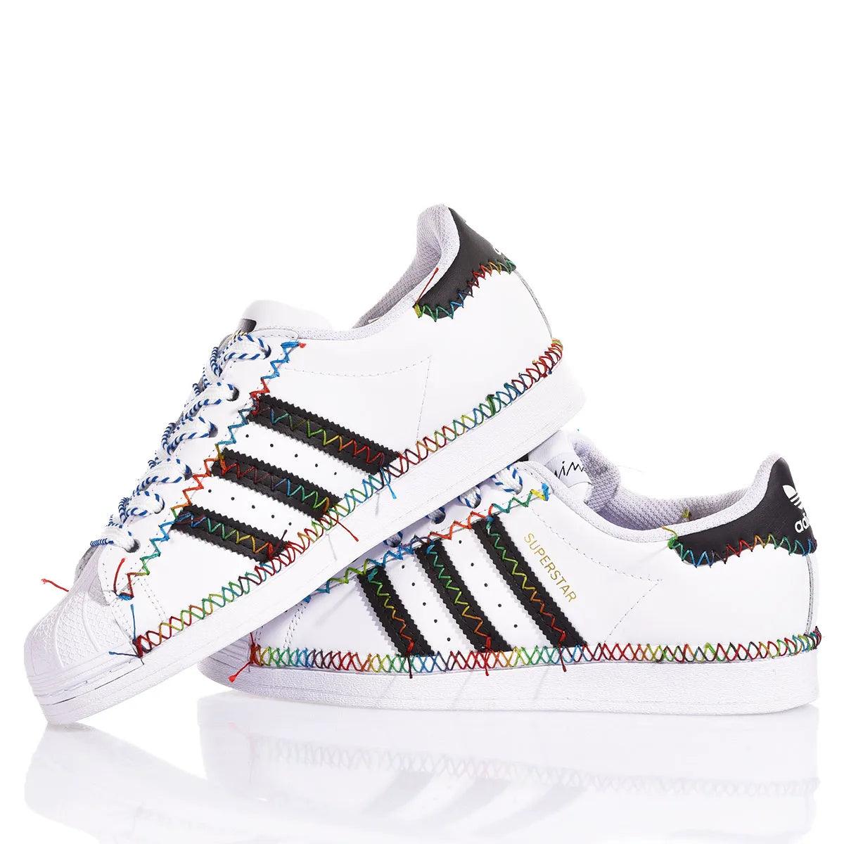 Le Adidas Superstar Wax sono l'emblema del design iconico rivisitato con un tocco contemporaneo. Questo classico modello Adidas è impreziosito da una doppia cucitura zig zag multicolor che attraversa tutta la tomaia, creando un effetto dinamico e vivace. I lacci in cotone bianco, arricchiti da impunture a vista color blu, aggiungono un ulteriore dettaglio di carattere, sottolineando la cura artigianale del design.