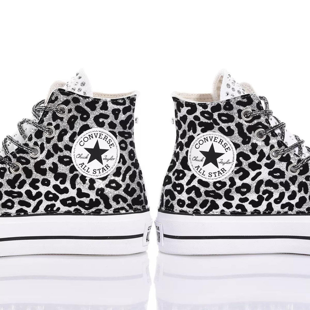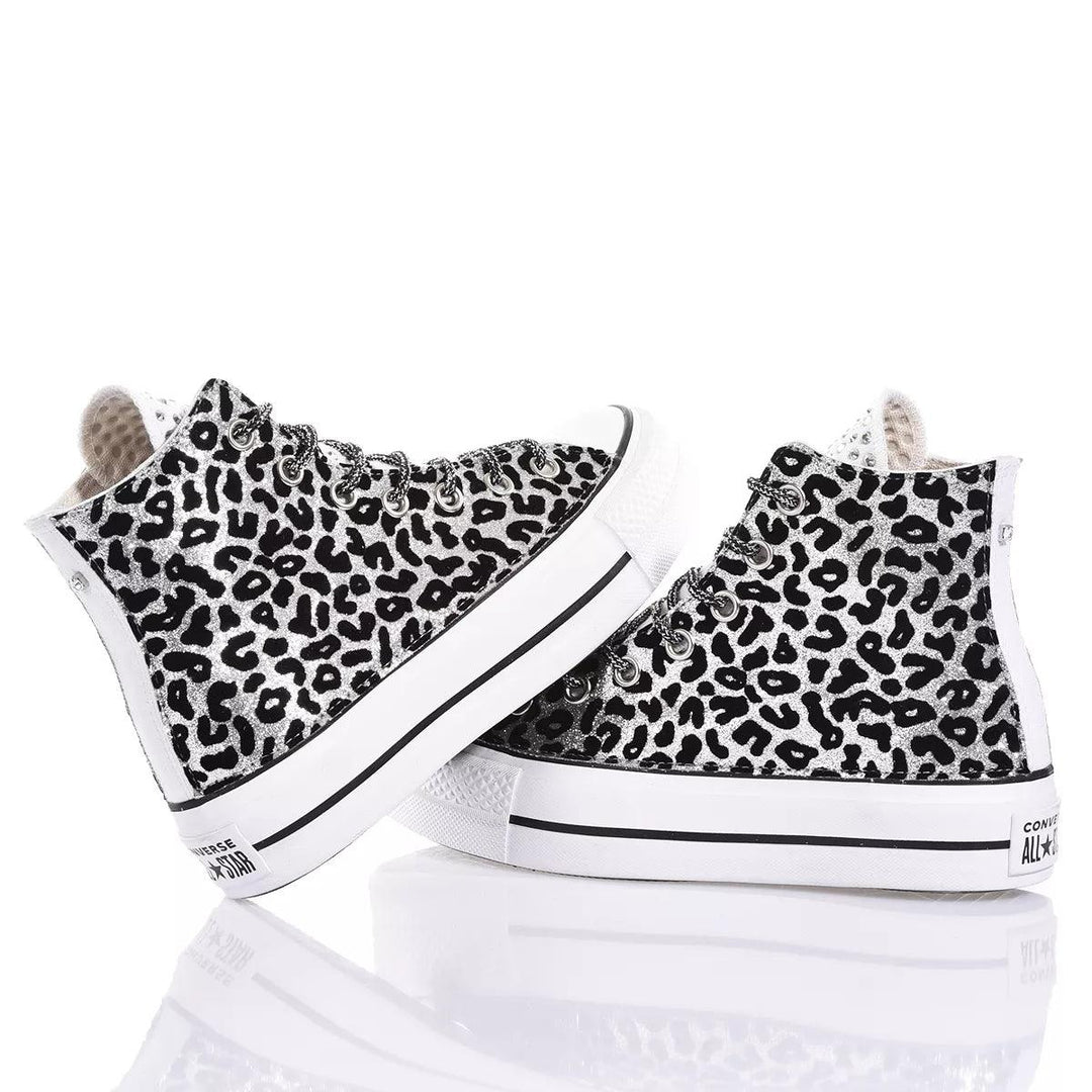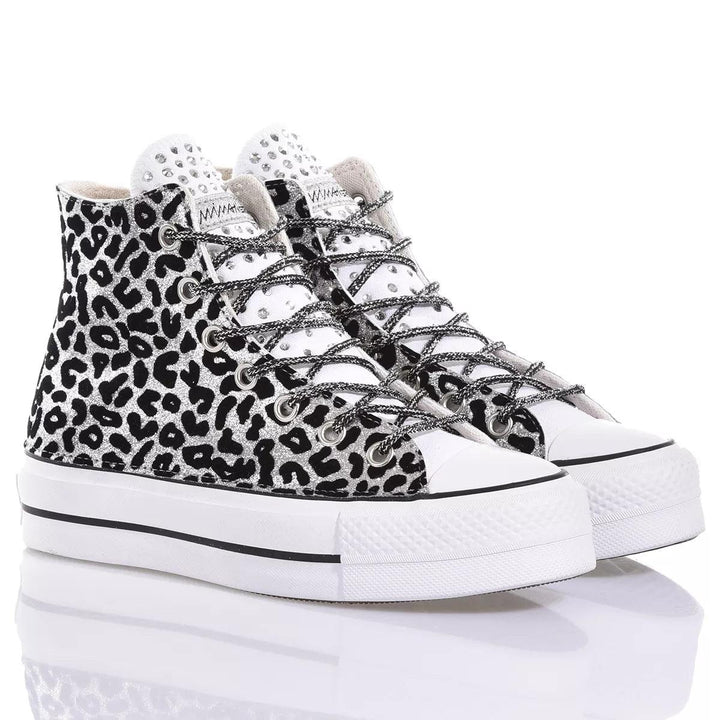 Converse Platform Leo Silver es la zapatilla personalizada para mujer revestida en tejido de purpurina plateada con estampado de leopardo negro, divertida y brillante gracias también a los cristales Swarovski que cubren la lengüeta y al remache en la parte trasera, esta zapatilla te cautivará con cada paso. Converse Platform Leo Silver se entregará con cordones laminados negros y plateados y sus cordones blancos originales. Para mayor comodidad, ofrecemos nuestra plantilla elevadora de talón que no solo proporciona comodidad sino que también te da algunos centímetros extra y un impulso inmediato en la figura.
