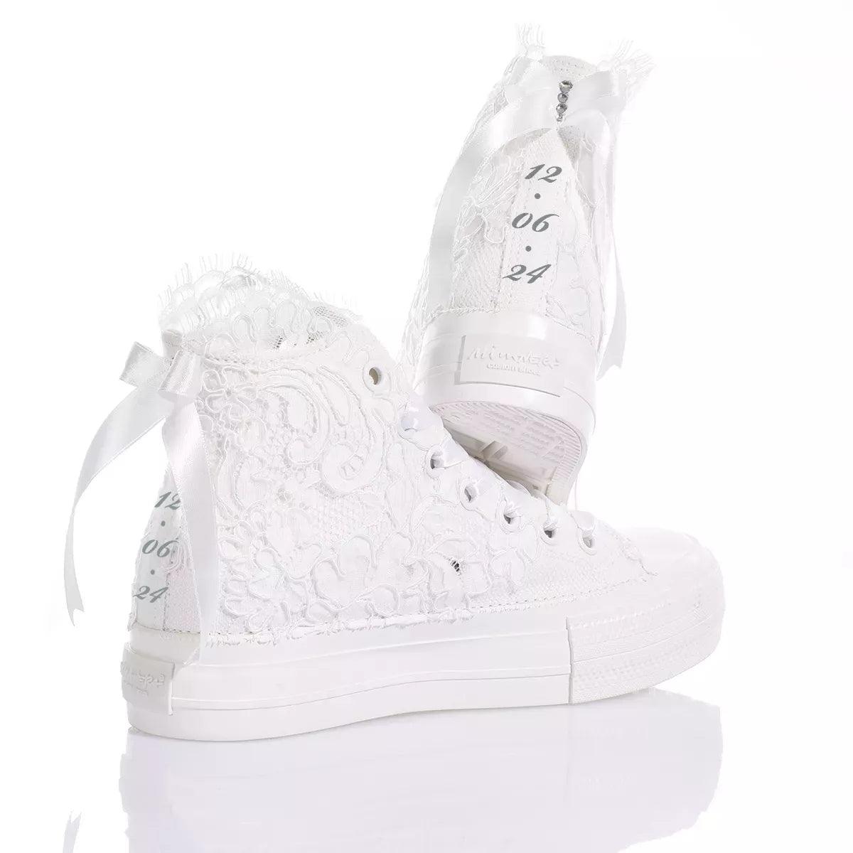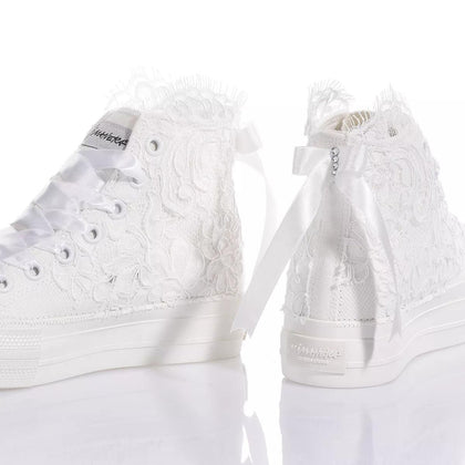 Mimanera Airlines Platform Amabel es un sueño hecho realidad. Inspiradas en el clásico modelo Converse, estas zapatillas cuentan con una suela plataforma completamente blanca para una sensación inconfundible de impulso y comodidad con cada paso. Mimanera Airlines Platform Amabel está cubierta con exquisito encaje bordado con un lazo de satén en la parte trasera, todo adornado con una fila de cristales Swarovski en el talón y elegantes cordones de satén blanco.