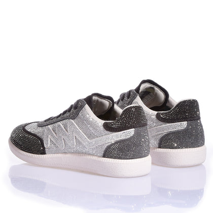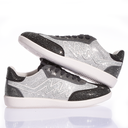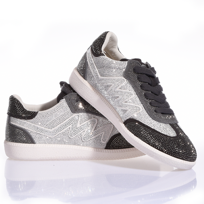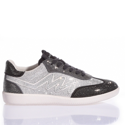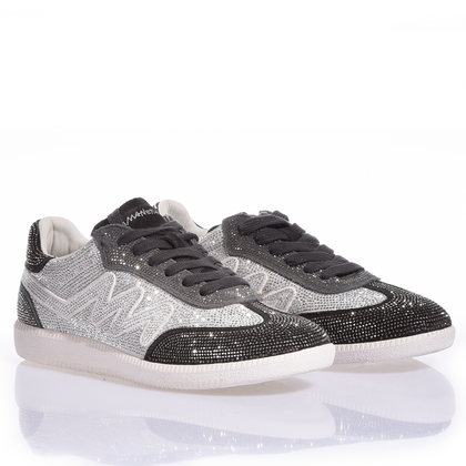 Mimanera Dubai Imperial Full Jet. Completamente cubierta de brillantes cristales Swarovski, esta zapatilla captura la luz con cada movimiento. La célebre "M" de la marca es de cristal Swarovski puro, mientras que la parte delantera, la puntera y el talón están cubiertos de Swarovski negros, creando un contraste fascinante que realza su diseño audaz. El resto de la parte superior brilla con cristales Swarovski puros, un juego de luces que no pasa desapercibido. Perfecta para quienes no temen brillar y quieren llevar la elegancia premium incluso a los detalles más pequeños. Cuando el lusso se encuentra con el estilo urbano, nace Dubai.
