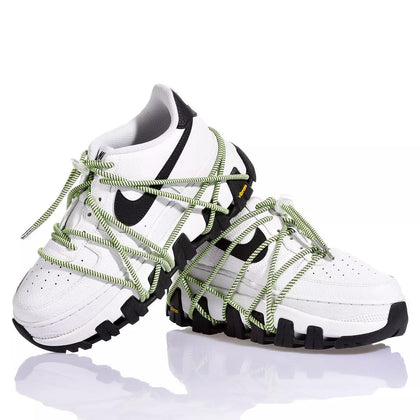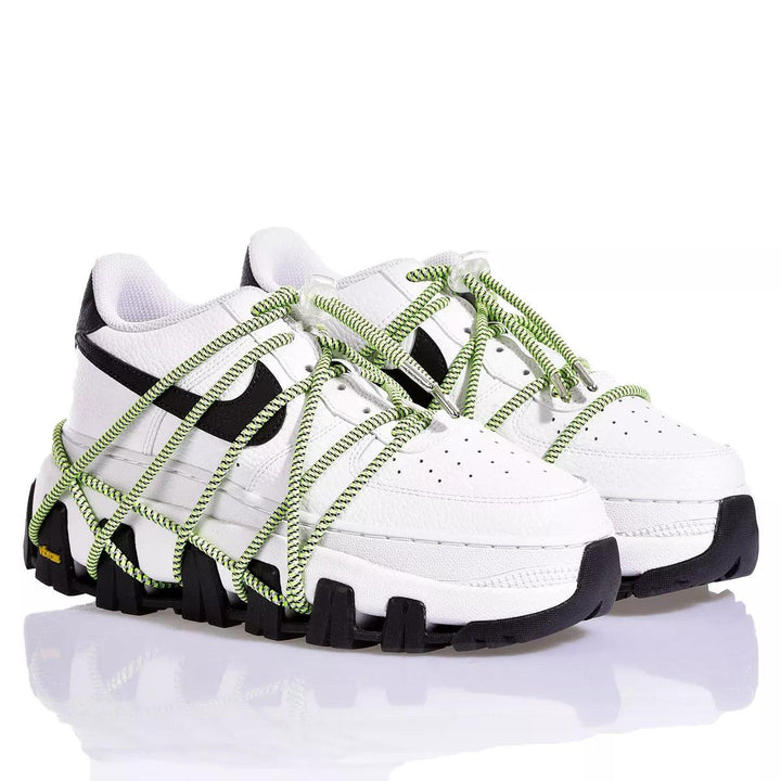 ¡Nike Air Force 1 Vibram Pack es la zapatilla personalizada que no esperabas! El icónico modelo de Nike se encuentra con la tecnología de suela Vibram gracias a la interpretación de Mimanera: un juego de entrelazados con un cordón elástico de tonos fluorescentes que cubre toda la parte superior y pasa por la suela. Gracias al tope transparente, ajustar el cordón, crear tu propio patrón o cambiar el cordón será muy fácil. ¡Puedes hacer único tu Nike AIR FORCE 1 Vibram Pack cada vez que quieras!