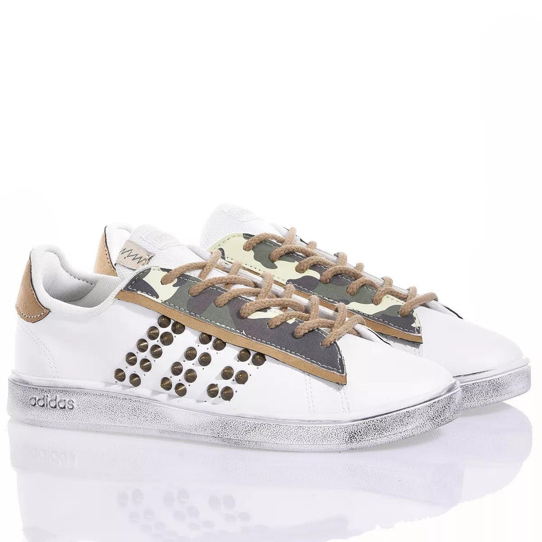Adidas Camo Studs est la basket personnalisée pour homme, à la fois urbaine et audacieuse, avec le dos et le détail sous les lacets en éco-suède couleur café glacé, mais ce qui lui donne vraiment un supplément d'âme, ce sont les lacets camouflage et les trois bandes emblématiques d'Adidas en effet vintage clouté.