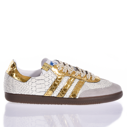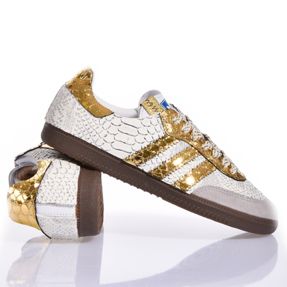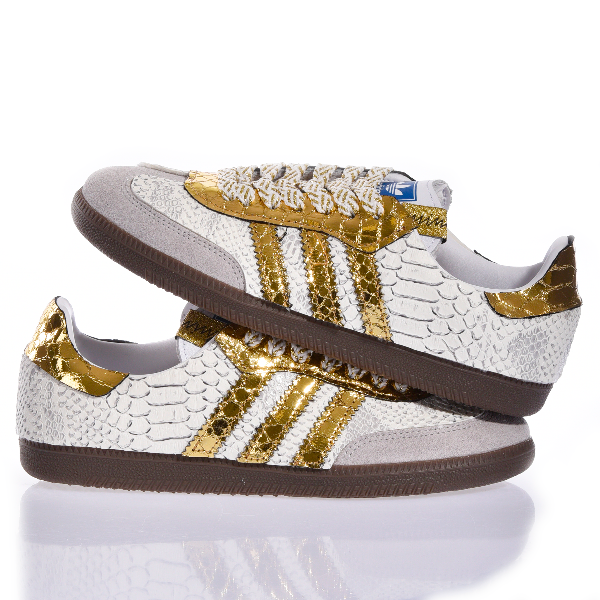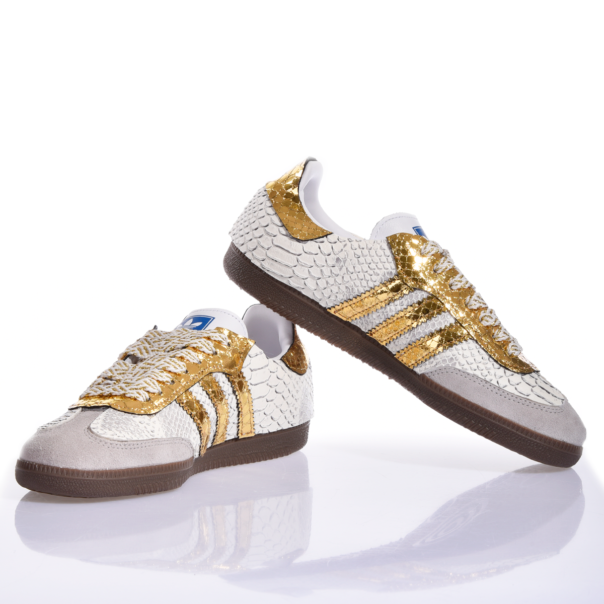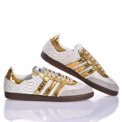 Une icône intemporelle se pare d’une nouvelle lumière. La légendaire Adidas Samba se réinvente dans une version exclusive, enveloppée d’un tissu beige effet python sur les côtés et sublimée par des détails en python doré sur le talon, les finitions et les œillets.