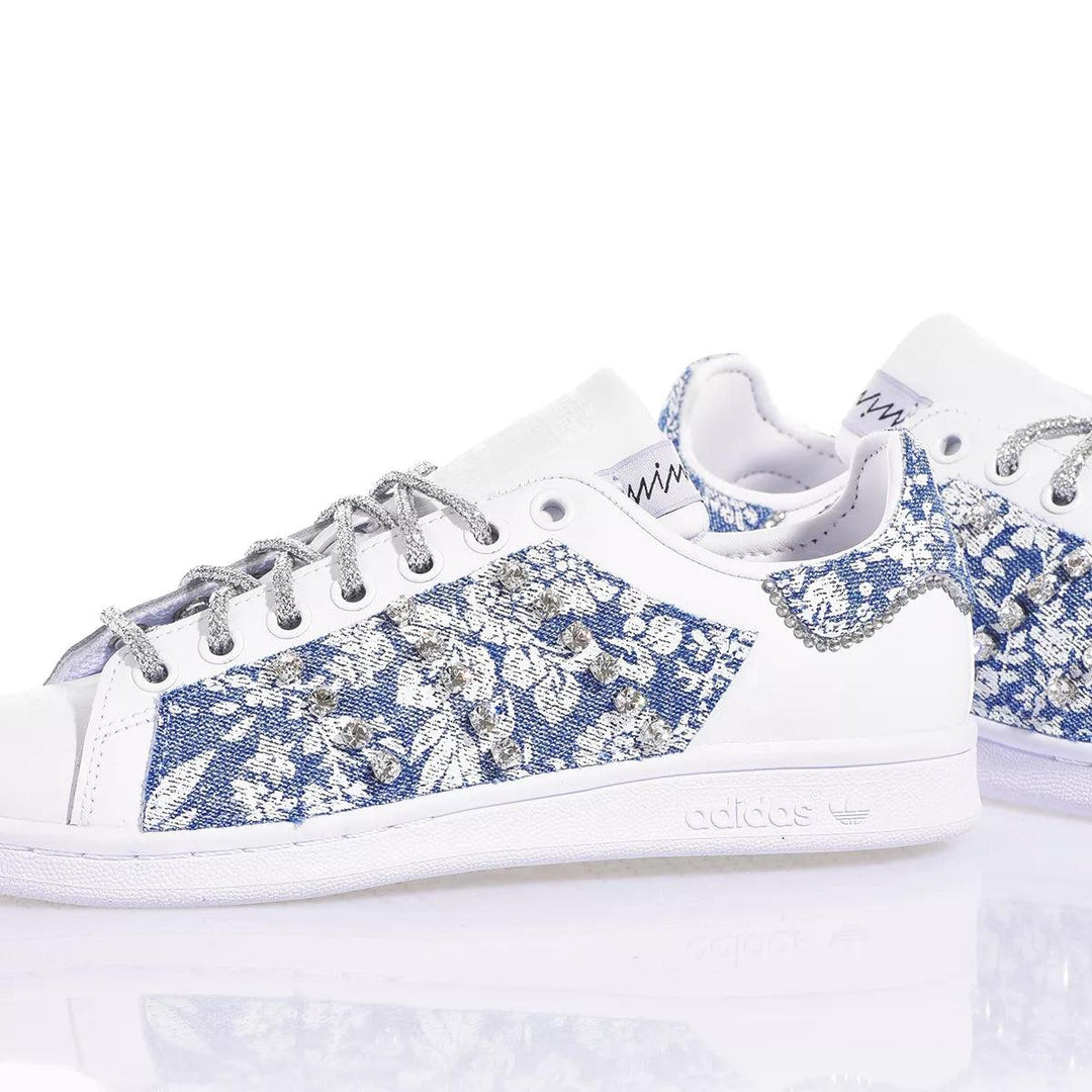 Adidas Stan Smith Flower Jeans è la sneakers custom da donna glamour ed elagante ideale per elevare ogni look. Ricoperta di denim floreale su retro e lati, impreziosita da castoni abbinati ai lacci lurex argento per uno scintillio assicurato.