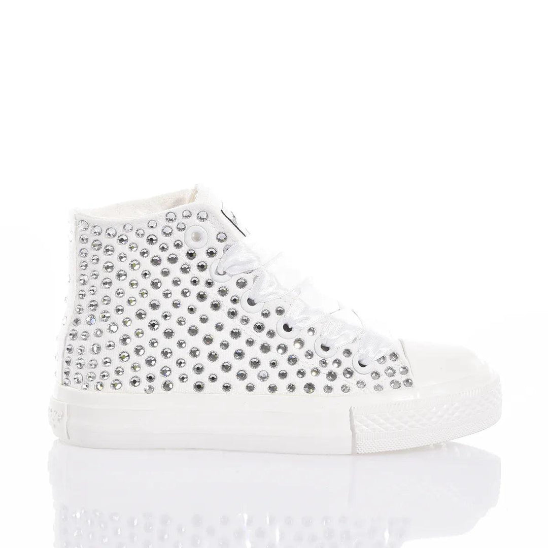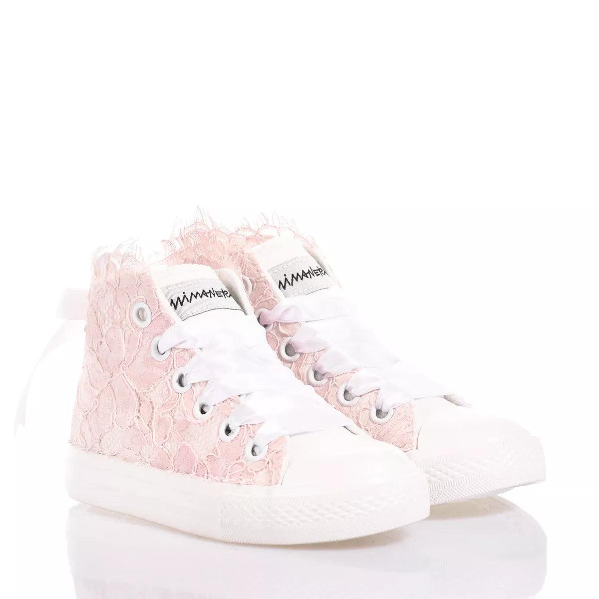 Mimanera Airlines Junior Pink Amabel, un rêve devenu réalité.Inspiré du modèle classique Converse, recouvert de dentelle fine brodée dans une délicate teinte rose et orné d’un nœud en satin à l’arrière, le tout sublimé par une rangée de cristaux Swarovski sur le talon et des lacets en satin blanc élégant, rendant ce modèle ultra glamour même pour les plus petits !