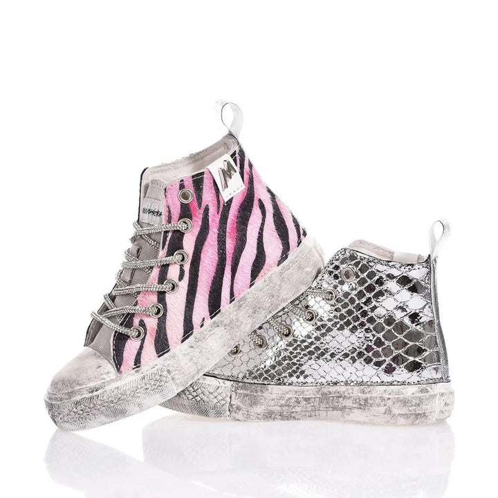 Inspirées du modèle classique Converse, elles présentent un côté extérieur en motif zèbre rose délavé, et un côté intérieur en simili cuir python argenté.