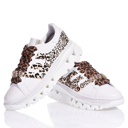 Adidas Stan Smith Rise Leo è la sneakers custom da donna che non immaginavi potesse esistere: comoda, versatile e capace di slanciare la figura! La sua particolare struttura con doppia suola leggera ti permette di distinguerti con eleganza in ogni occasione e look. L’ecopelle leopardata disegna una forma unica sulla tomaia, impreziosita da borchie dorate che aggiungono un tocco di lusso. Un ulteriore dettaglio di raffinatezza è il gioiello rosa e oro applicato sul fondo dell'allacciatura. Ogni paio di Adidas Stan Smith Rise Leo è fornito con lacci leopardati e i suoi lacci originali, per un look ancora più personalizzabile.