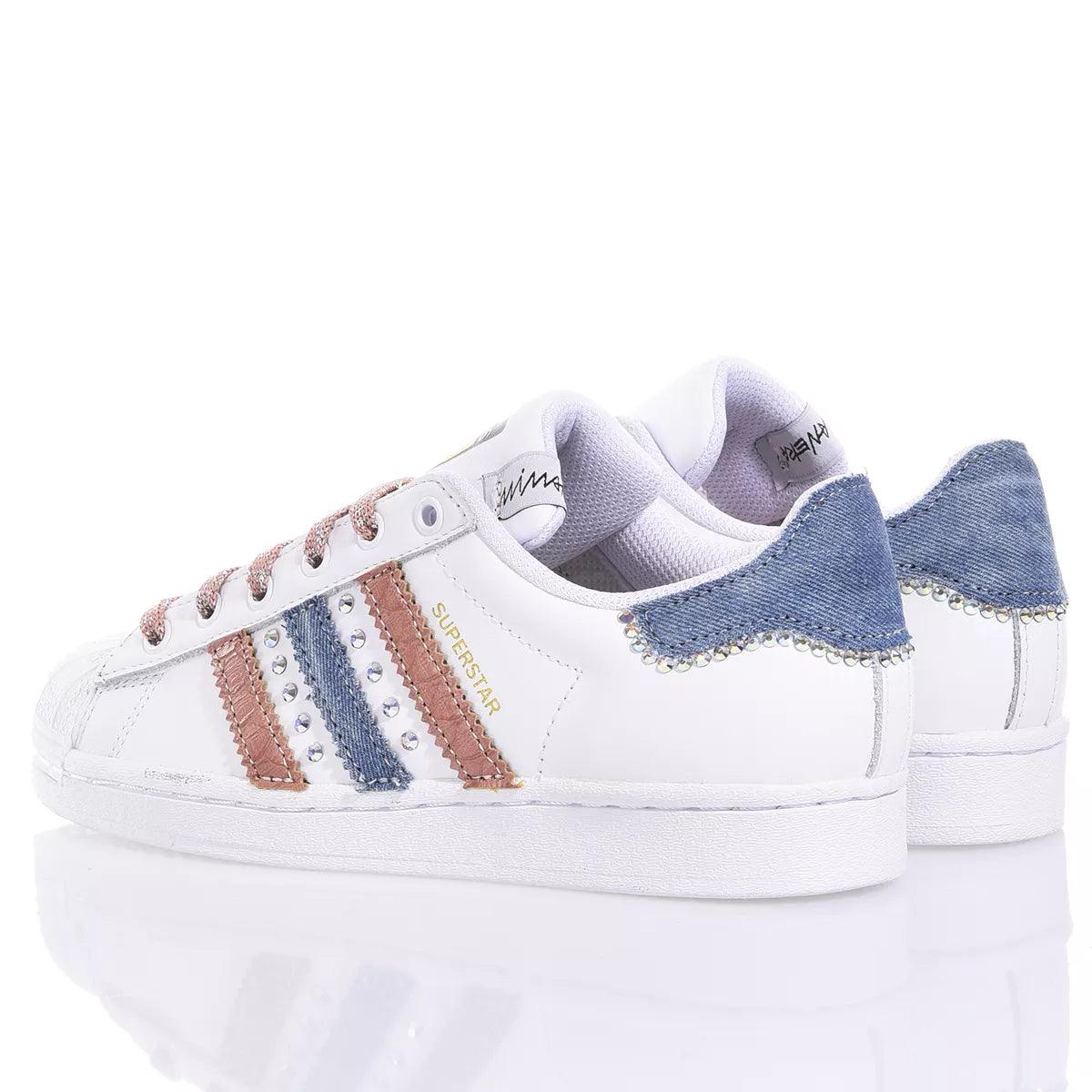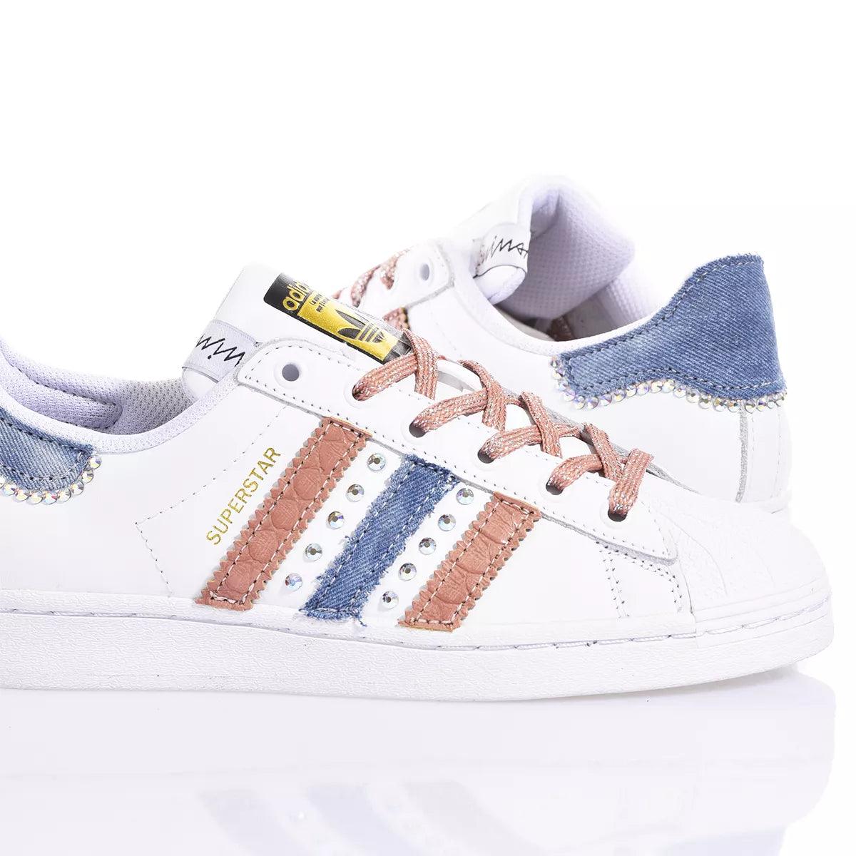 Adidas Superstar Ligis è la sneakers custom da donna delicata e versatile. Denim sul retro e tra le iconiche righe Adidas perfettamente mixato ad un ecopitone rosa caldo. Tocchi di luce rendono Adidas Superstar Ligis superfemminile grazie agli Swarovski tra le righe e sul retro. Completano il look di questa sneakers i lacci lurex argento e rosa.