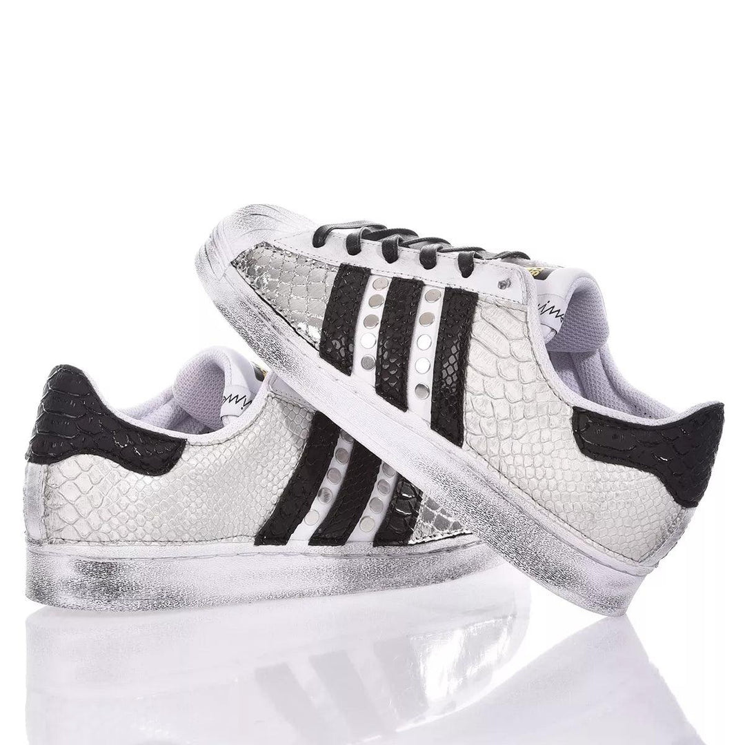 Adidas Superstar Silverware è la sneakers personalizzata uomo e donna in stile pitonato e metallico. La parte posteriore è ricopera da un tessuto pitonato bianco con effetto argentato in abbinamento alla parte anteriore in tessuto metallizzato, le tre righe e il retro invece sono rivestite dal tessuto pitonato nero in abbinamento con i lacci cerati. A completare l'effetto street e metallizzato ci sono le borchie piatte e la sporcatura sulla suola.