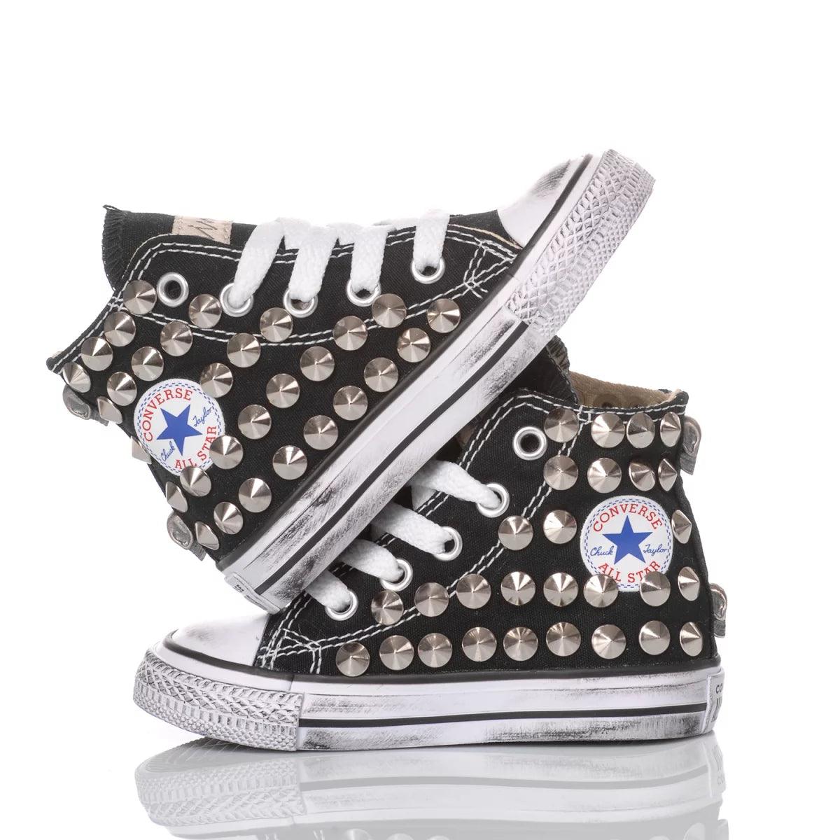 Converse All Star Baby Borchie Nera, un grande classico in casa Mimanera, per chi ci segue da tempo non servono descrizioni, ma rinfreschiamoci comunque la memoria: si tratta appunto della nostra classica sneakers nella versione alta riproposta anche sulla sneakers da bimbo per un perfetto stile matchy-matchy con il tuo piccolo, sulla quale vengono applicate e fissate manualmente e meticolosamente le borchie, sporcata per darle il giusto tono vintage, il risultato è una scarpa dall'animo un po' rock, per dare la giusta sicurezza e grinta ad ogni tuo passo. La Converse All Star Baby Borchie Nera ti verrà fornita con i suoi lacci originali bianchi.