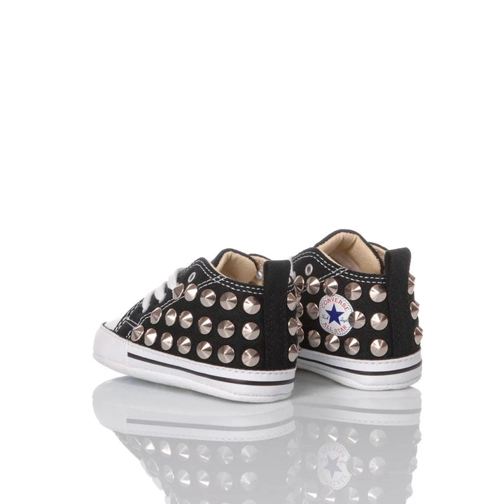 Converse All Star Culla Borchie Nera, sì, sono proprio loro, le converse da bebè customizzate per rendere anche i piedi dei più piccini super fashion ed alla moda. Queste piccolissime sneakers hanno i lati interamente borchiati argento, i suoi piedini saranno più rock che mai.