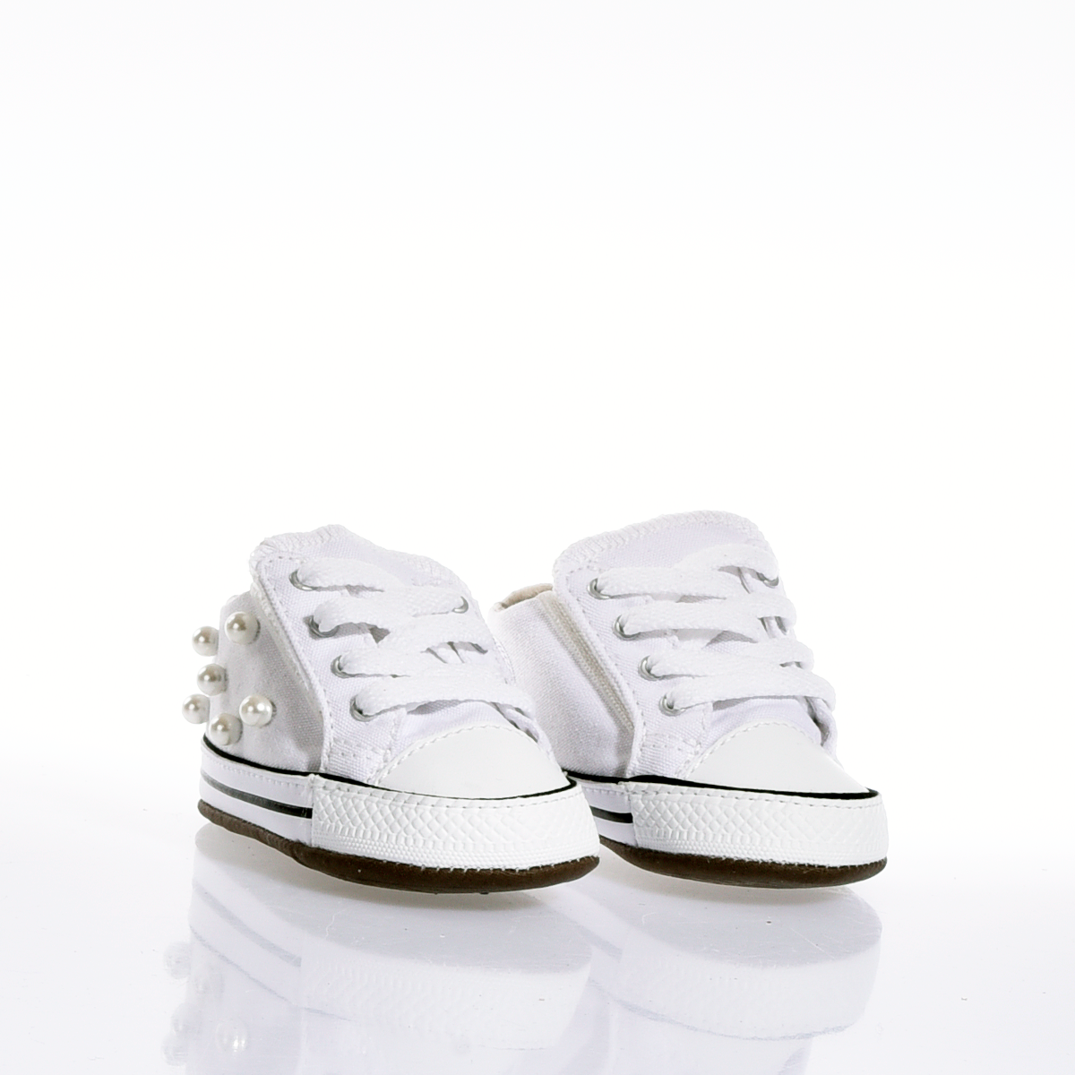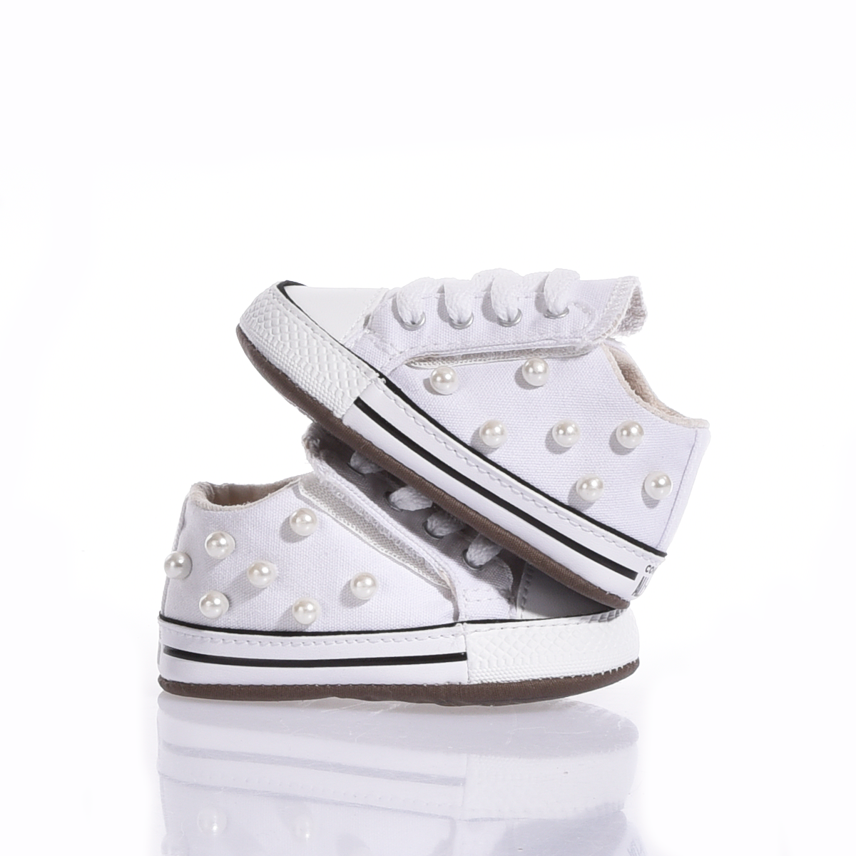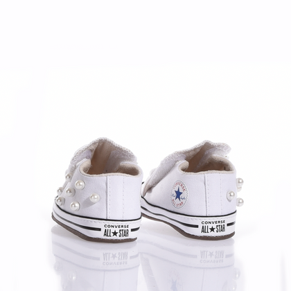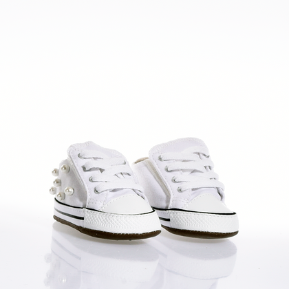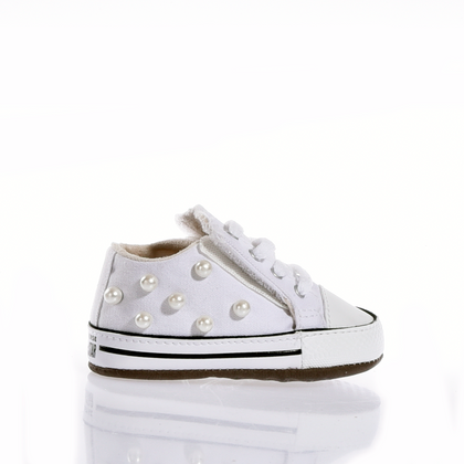 Stile sin dalla culla. Queste Converse personalizzate con perle bianche sono l'accessorio perfetto per i neonati che nascono già con carattere.