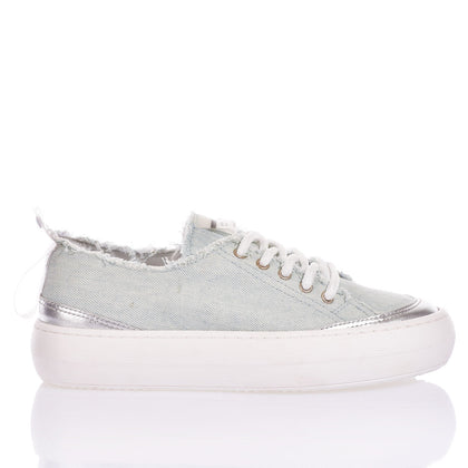 Mimanera Stone Denim Light : è la sneakers comoda e versatile in denim chiaro e dettagli laminati. Bordi sfrangiati e lacci bianchi per uno stile casual ed essenziale.
