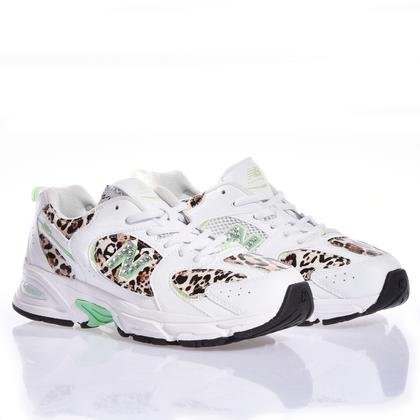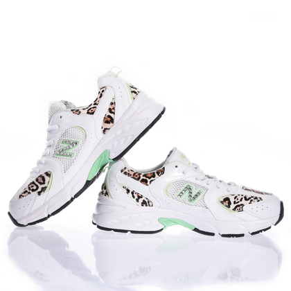 New Balance 530 Mint Safari: animalier meets sparkle. Tessuto leopardato strategicamente posizionato si sposa con dettagli mint, mentre il logo decorato con cristalli Swarovski cattura ogni riflesso. Una sneaker che trasforma qualsiasi look in puro stile.