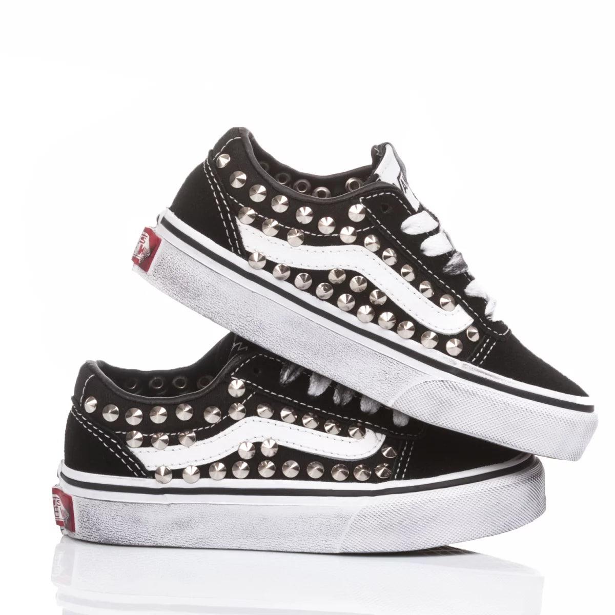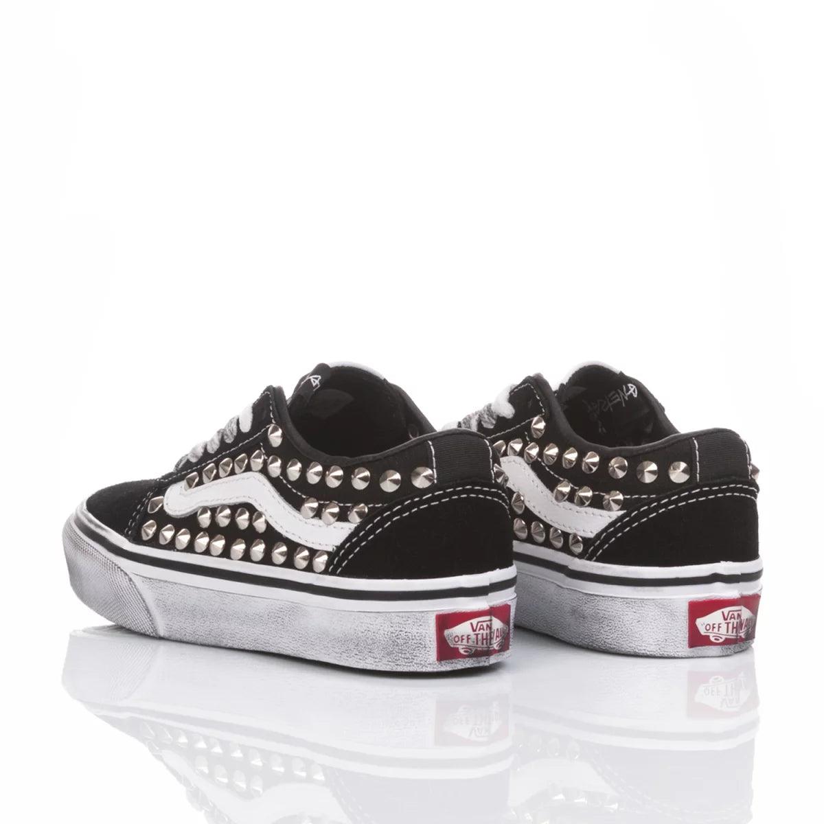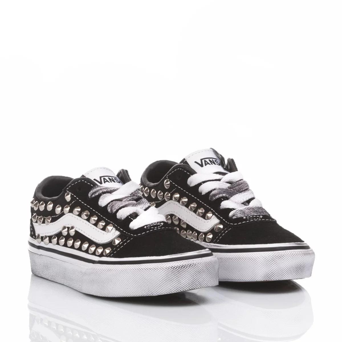 Vans Junior Full Borchie, modello classico nero rinnovato da una tempesta di borchie argento su entrambi i lati, completato da una sporcatura laterale per accenturare il tono vintage, adatta al look uomo e donna ed anche al bambino per un perfetto stile matchy-matchy con il tuo piccolo. La Vans Junior Full Borchie ti verrà fornita con i suoi lacci originali bianchi.