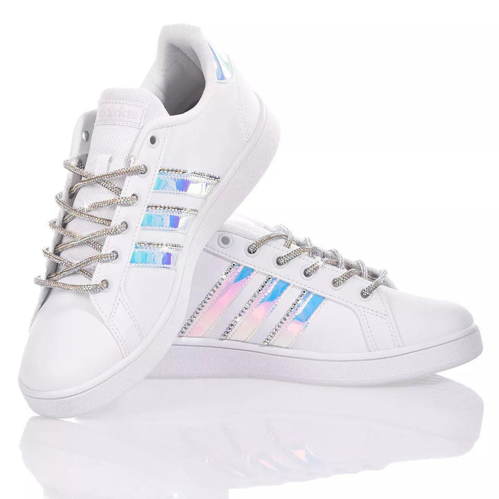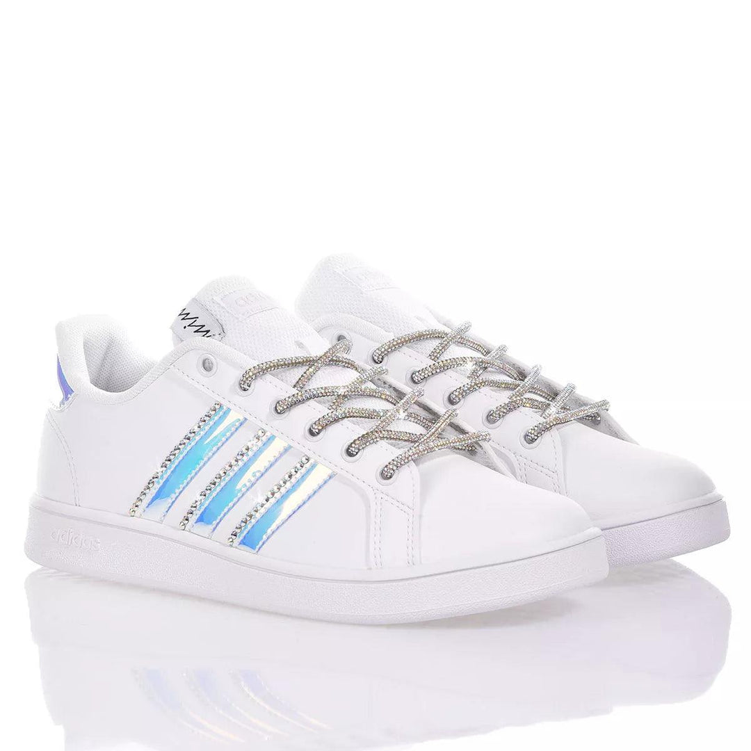 Adidas Streamer is the super sparkling customized women's sneakers, with shiny rhinestones applied in the same shades as the iridescent three stripes and back to create a perfect and unique match, completed by the precious Swarovski lace.